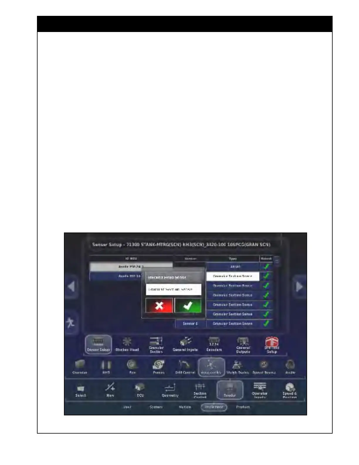 Select Implement/Seeder/Accessories/Sensor Setup.