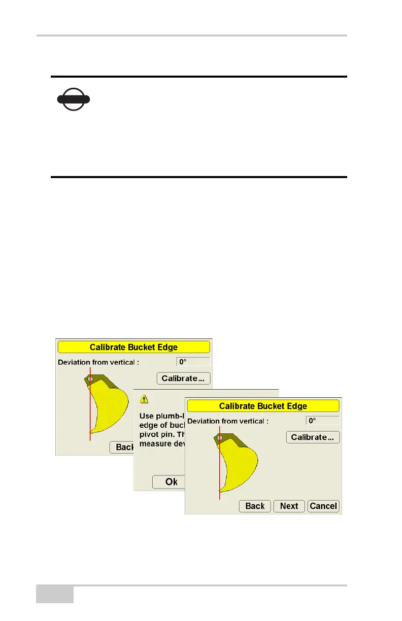 1. With the bucket plumb, press Calibrate. Press Ok at the