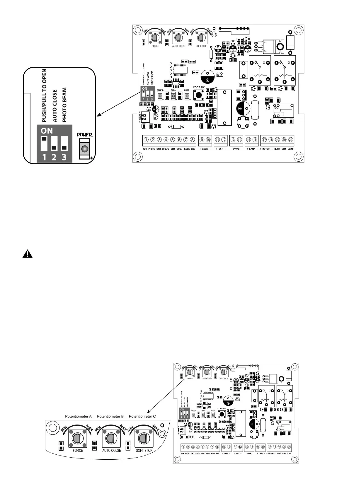There are 3 potentiometers located in the control board. They are used to adjust the stall force, auto-close time