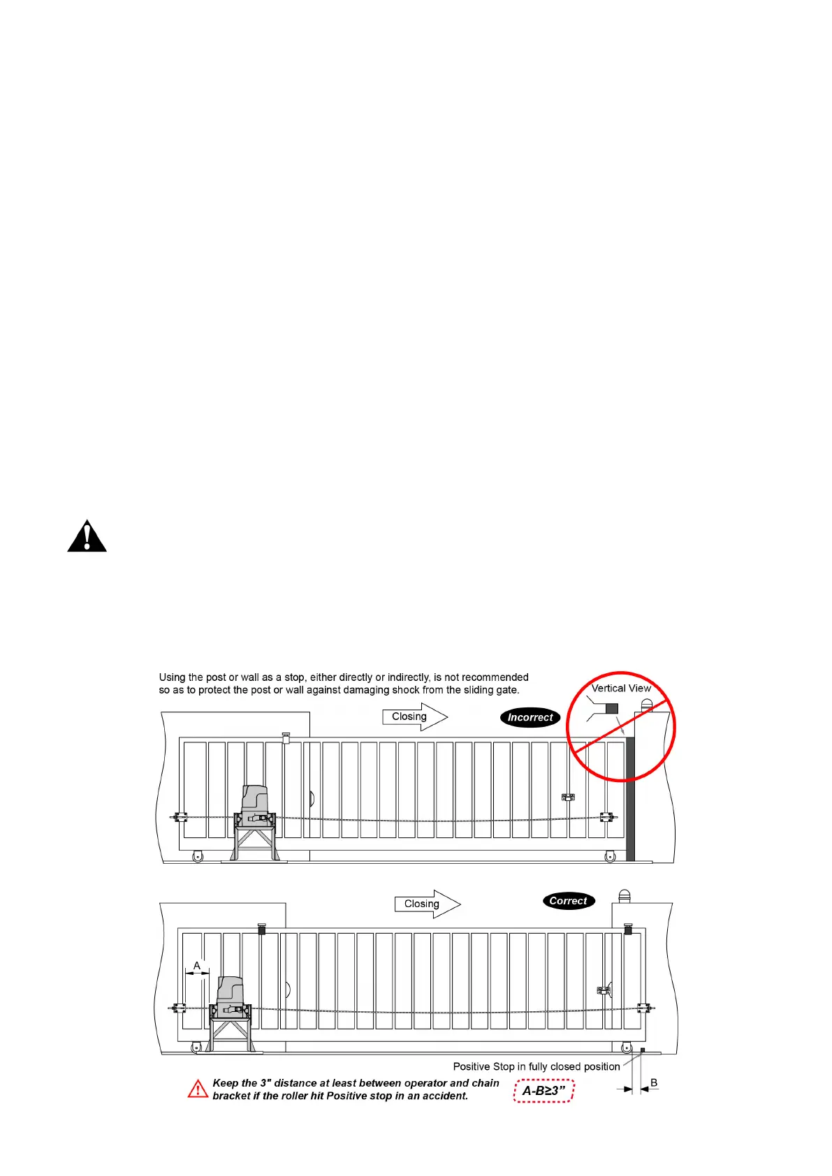 • Before installing the gate opener, check that all moving part as well as the sliding gate is in good