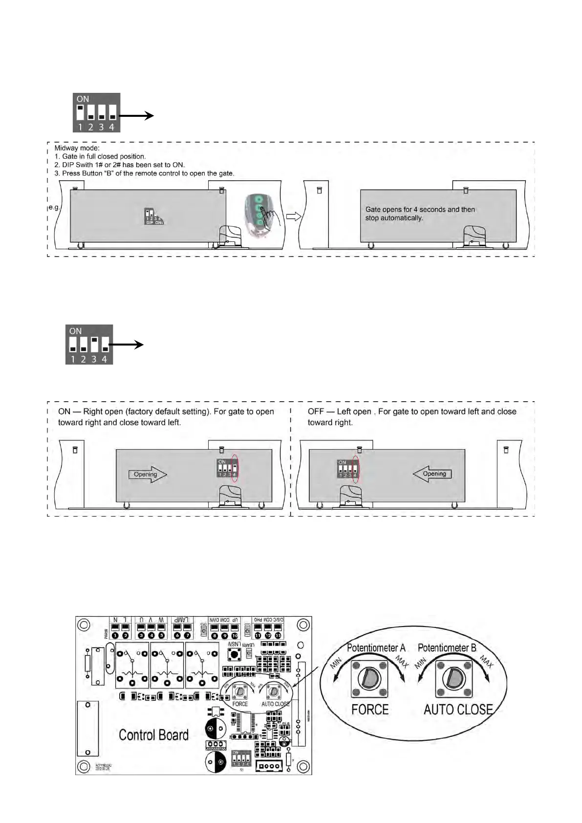 Potentiometer A and B are used to adjust the stall force and auto close time of the gate operator separately.
