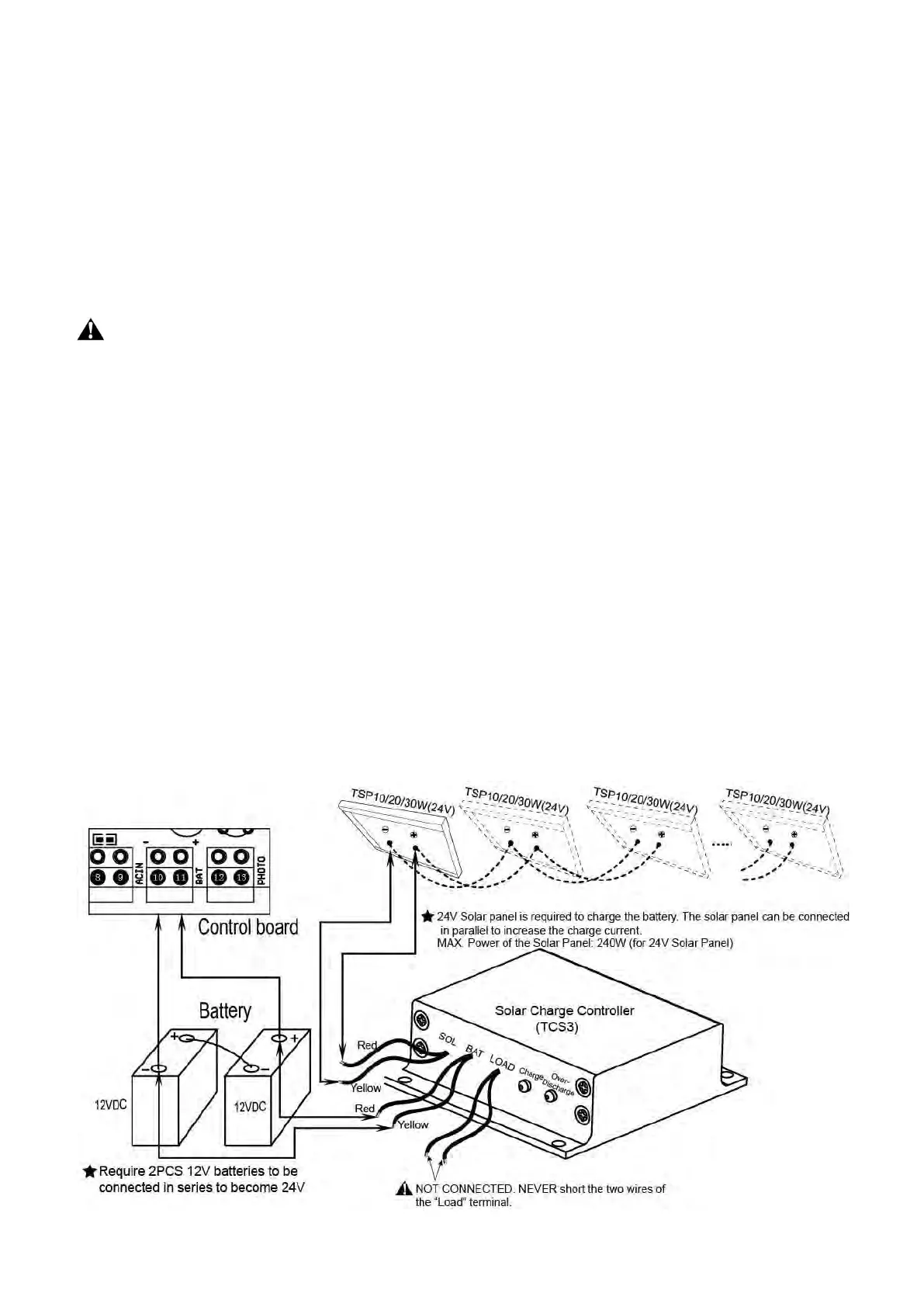 3. 2 PCS 12VDC batteries can be connected in series to function as 24VDC. The following diagram