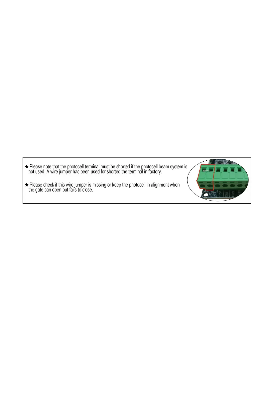 ~” terminal to the “+12V” terminal (#9). Also the “- ~” and “+ ~” terminals of the photocell’s receiver should