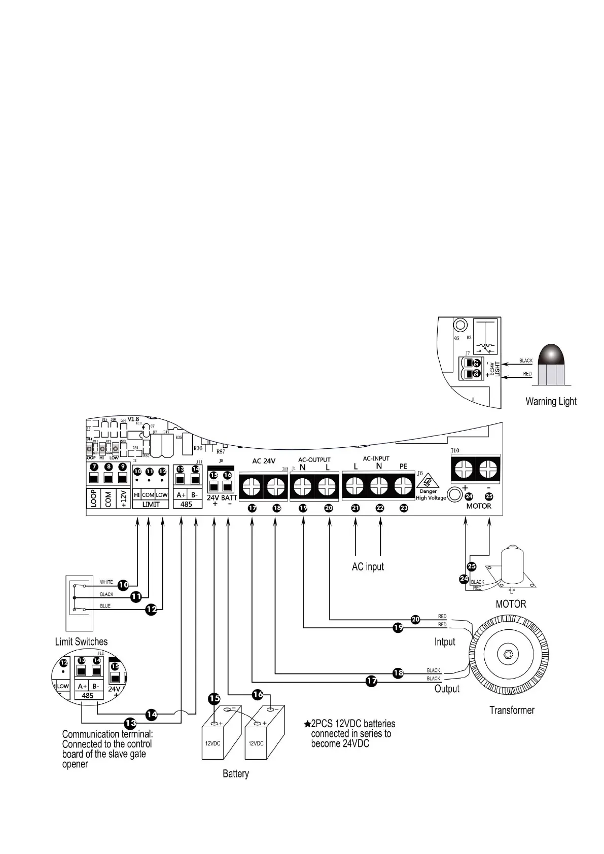 For the slave gate opener, you can only connect the AC power wire and the communication wire to