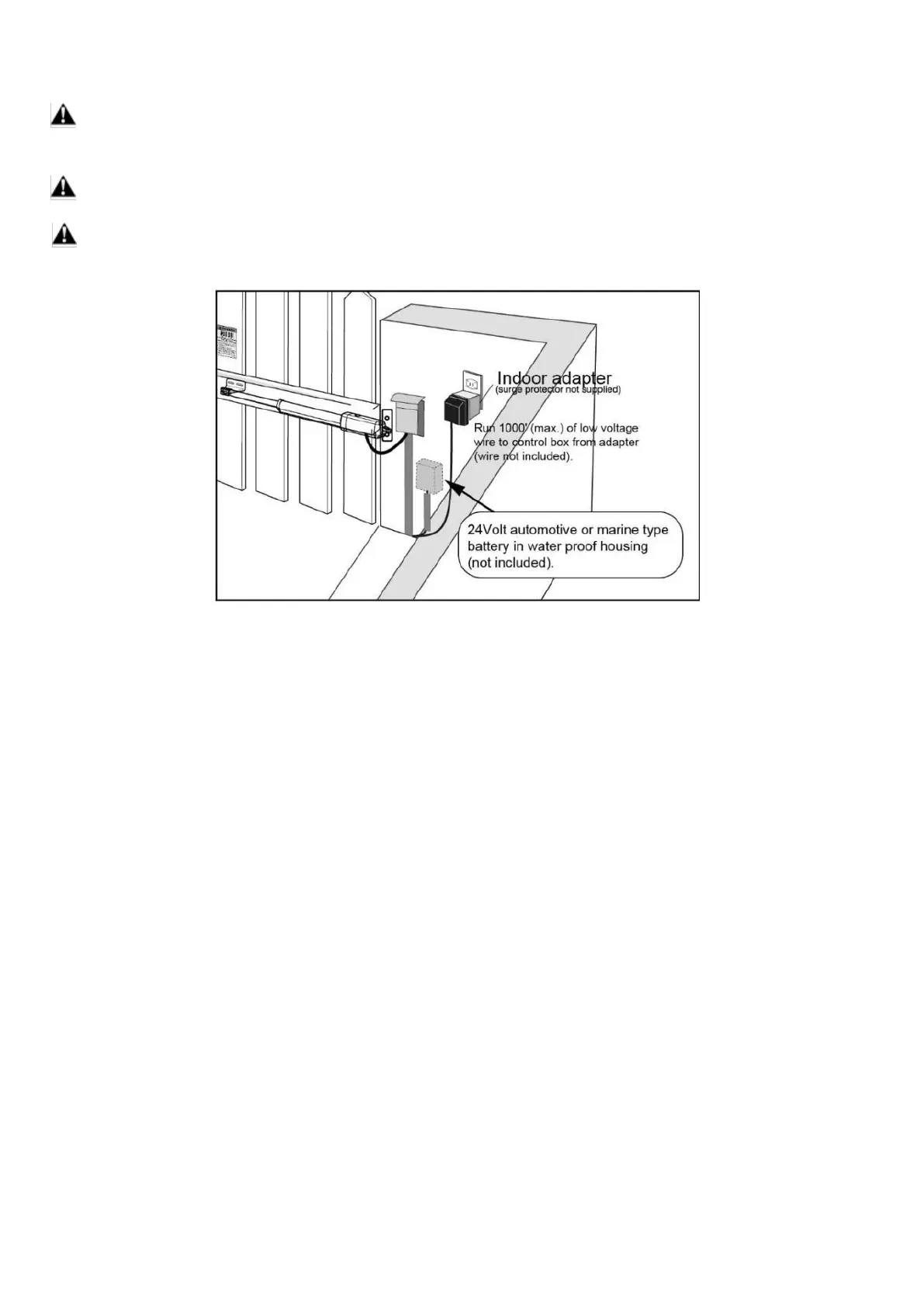 WARNING: NEVER connect the gate opener to the power outlet before all the installations have