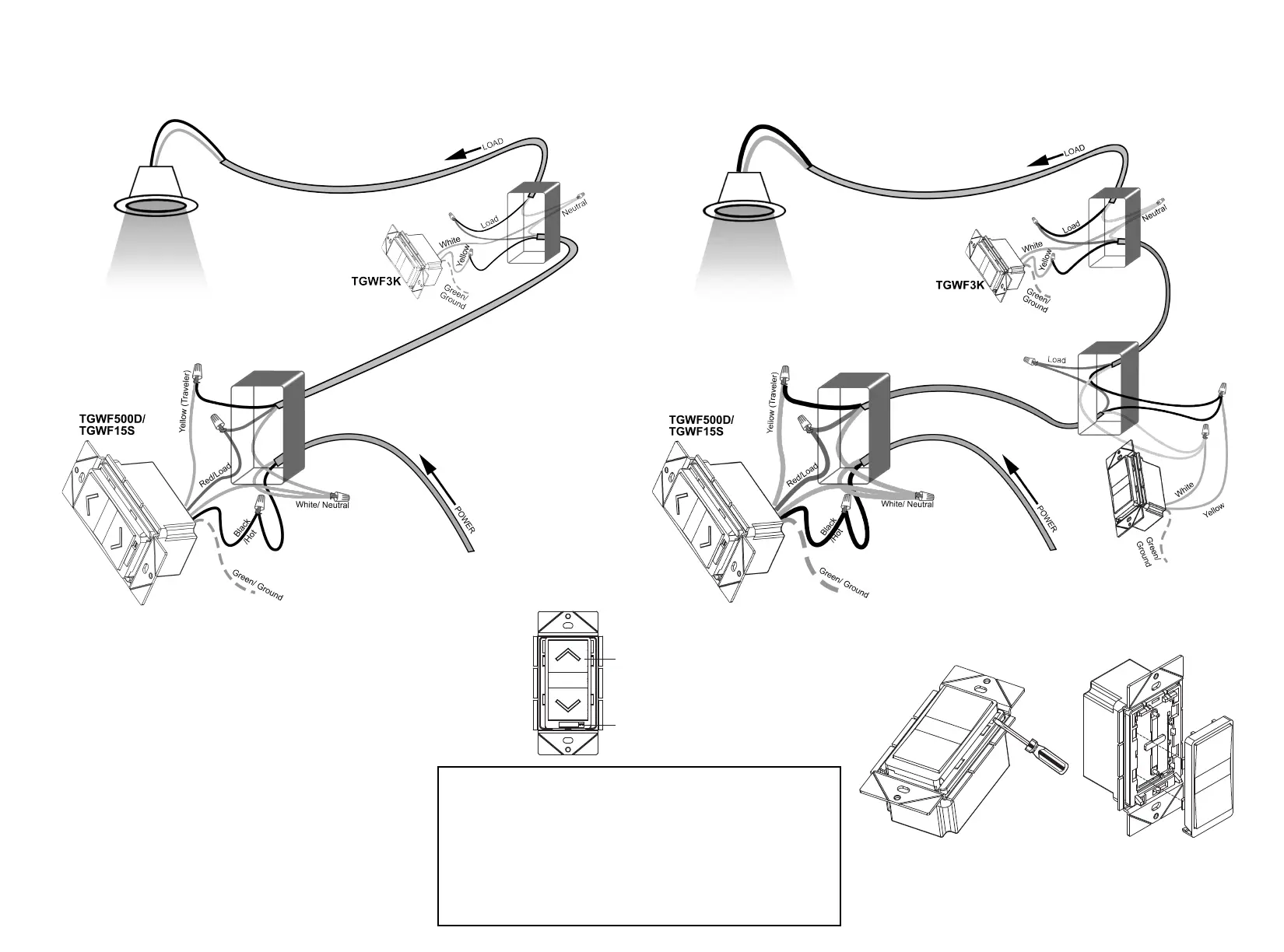 the primary switch (TGWF500D or TGWF15S) is installed at the location with the HOT wire.