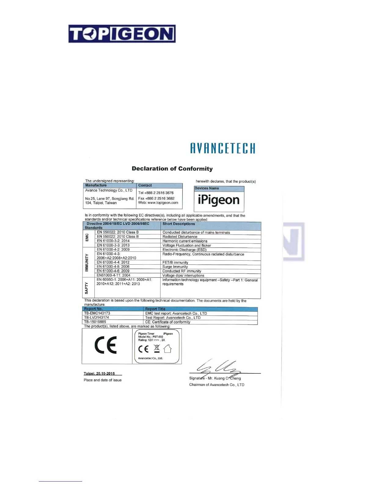TOPigeon iPigeon V8 - Declaration of Conformity; Ipigeon Timer