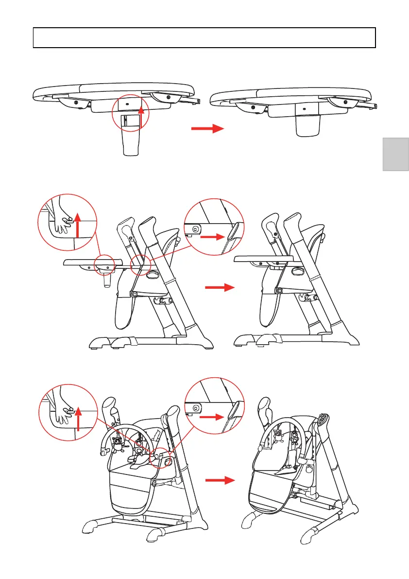 7. Druk op de knoppen van het eetblad en bevesg het eetblad op de stoel zoals