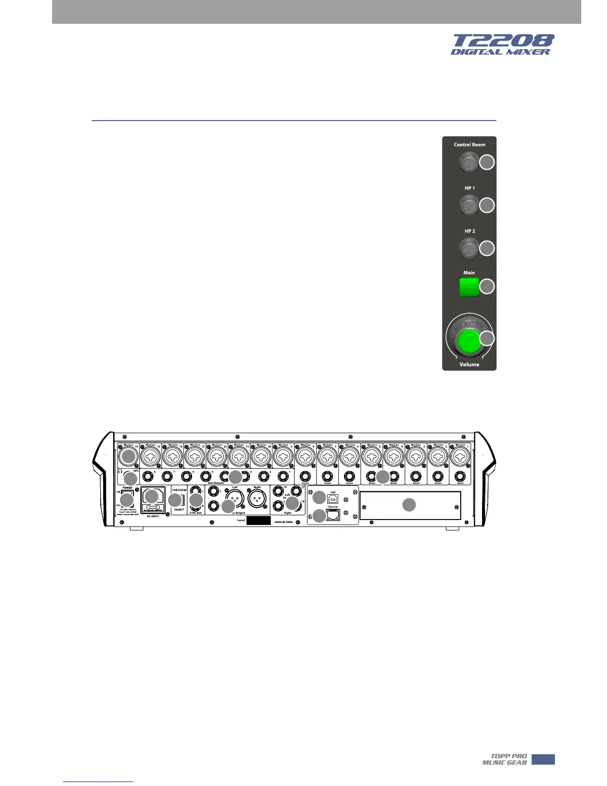 The T2208 equips 16 microphone preamplifiers for use with all types of microphones.
