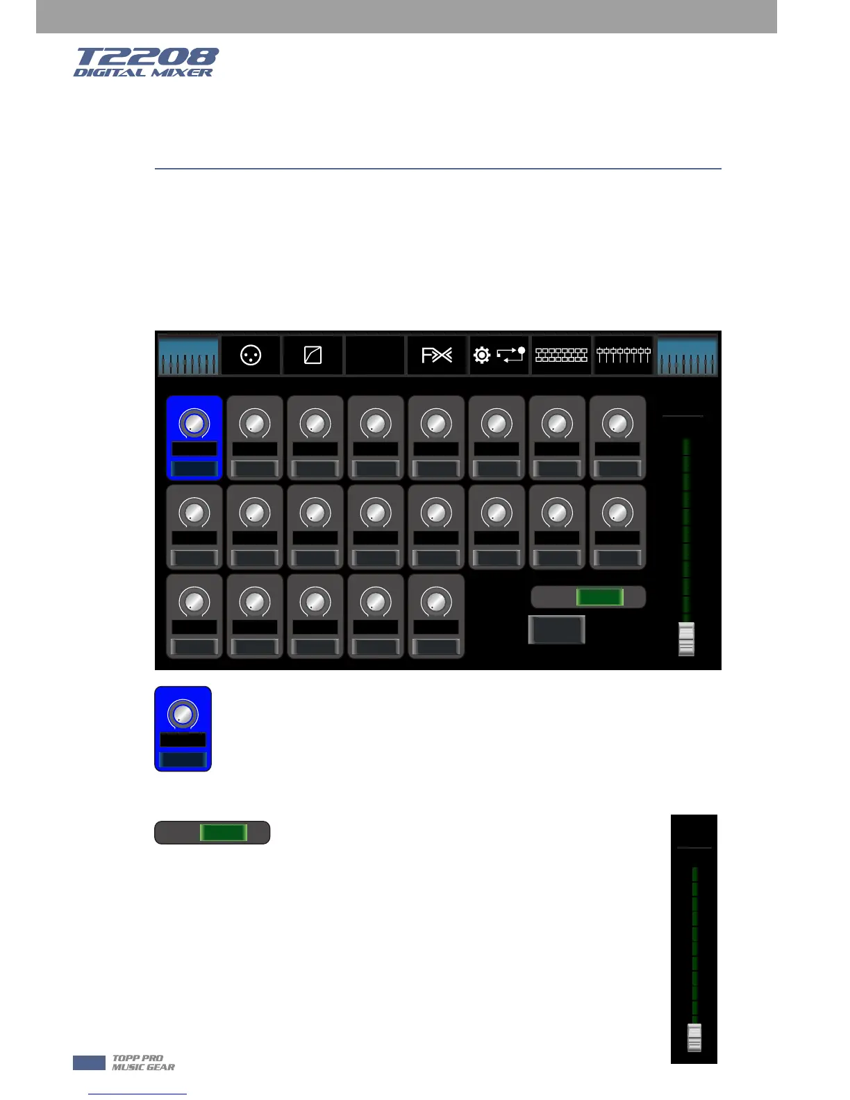 Parameter Adjust knob or slide long fader on the screen to change selected channel’s