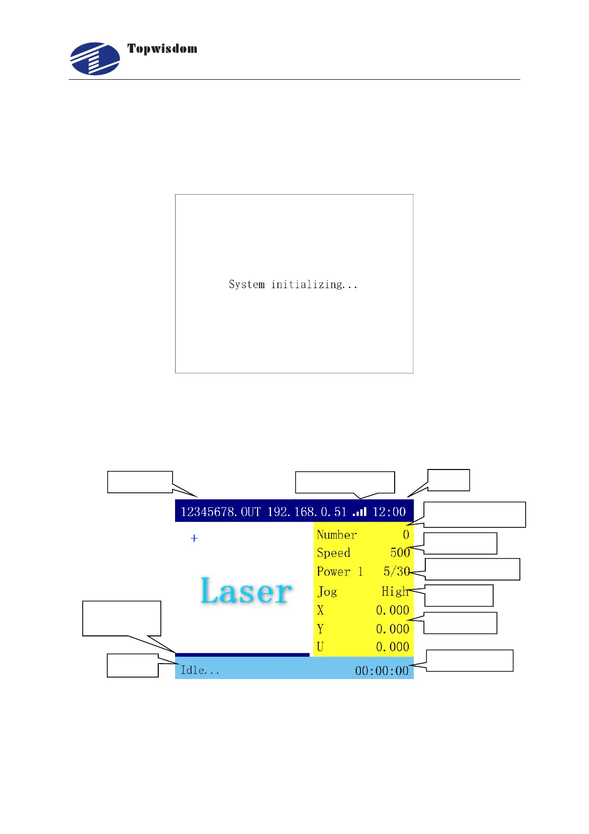 the machine status and the work time. When there is no work, the status displays "Idle...",
