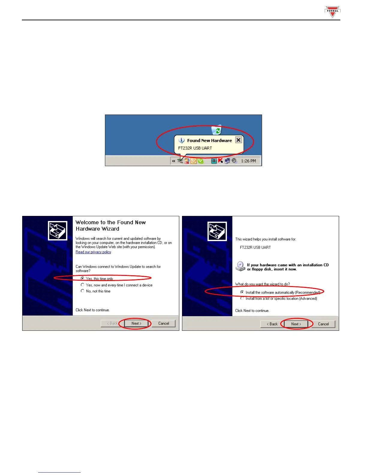 “Next”. Once driver “FT232R USB UART” has been found, select “Install the software automatically (Recommended)”