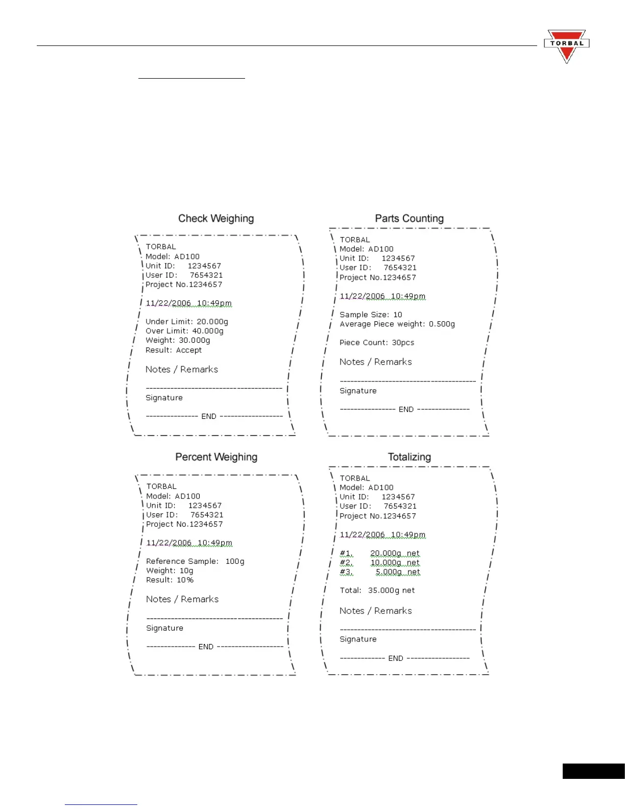 After completing a weighing transaction, result data receipt may be printed. To initiate