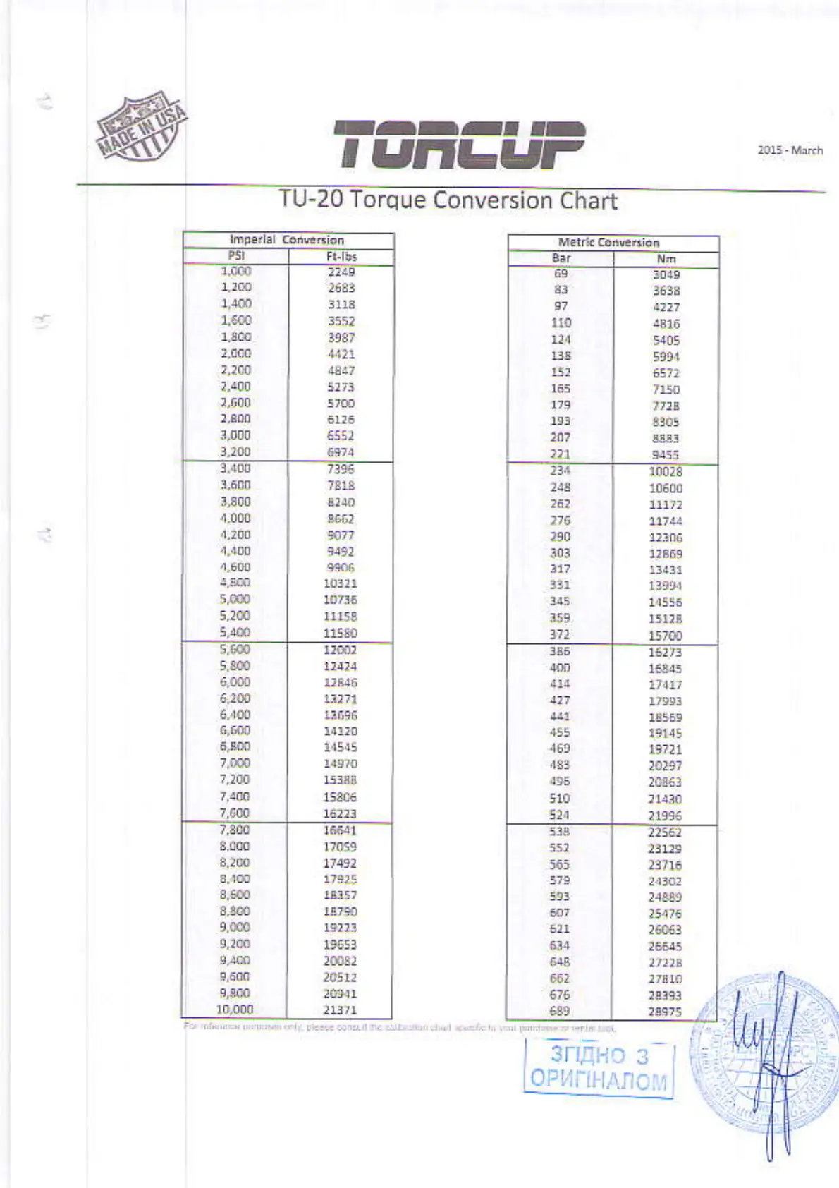 TorcUP TU Series - TU-20 Torque Conversion Chart