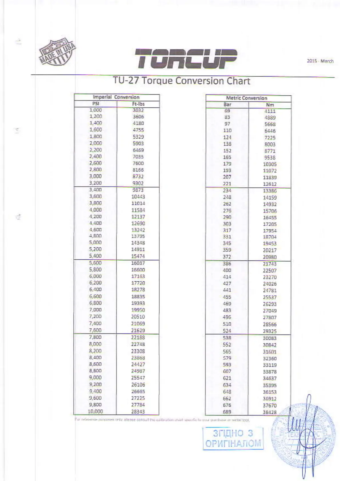 TorcUP TU Series - TU-27 Torque Conversion Chart