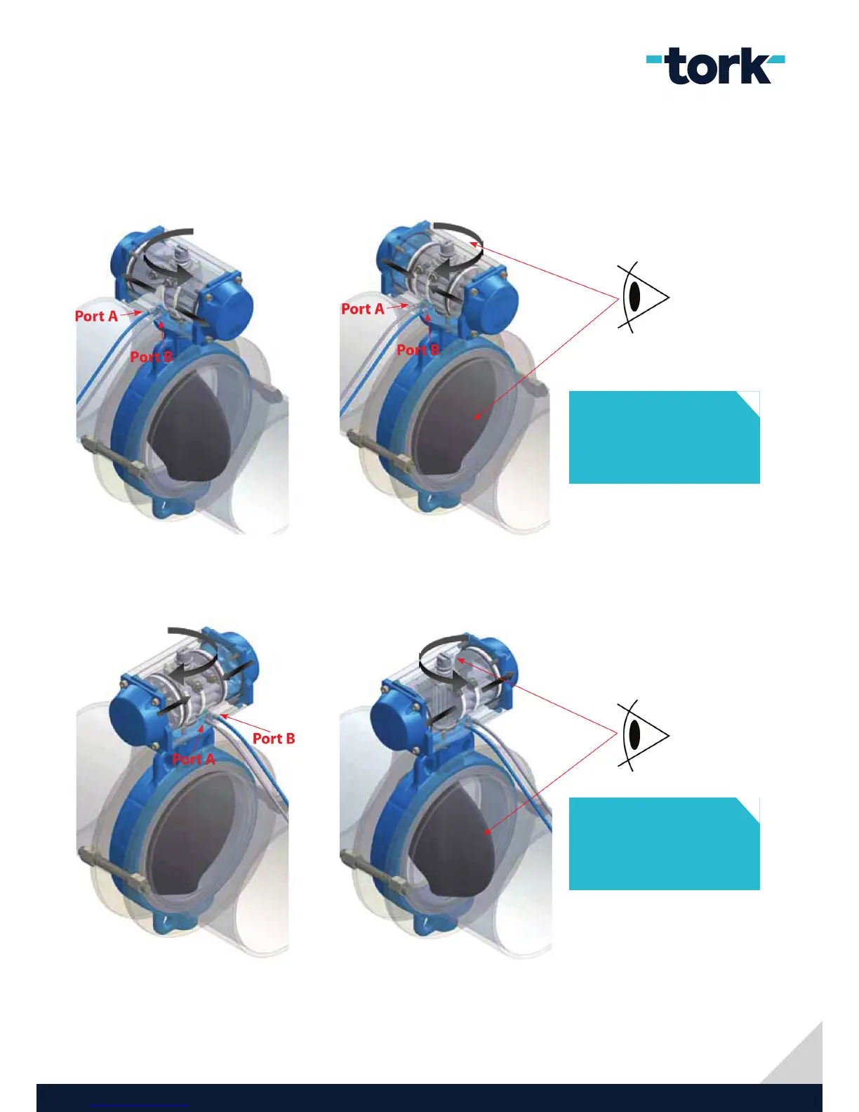 Port B: Pressurized for close the valve. Actuator rotates CW for closing.