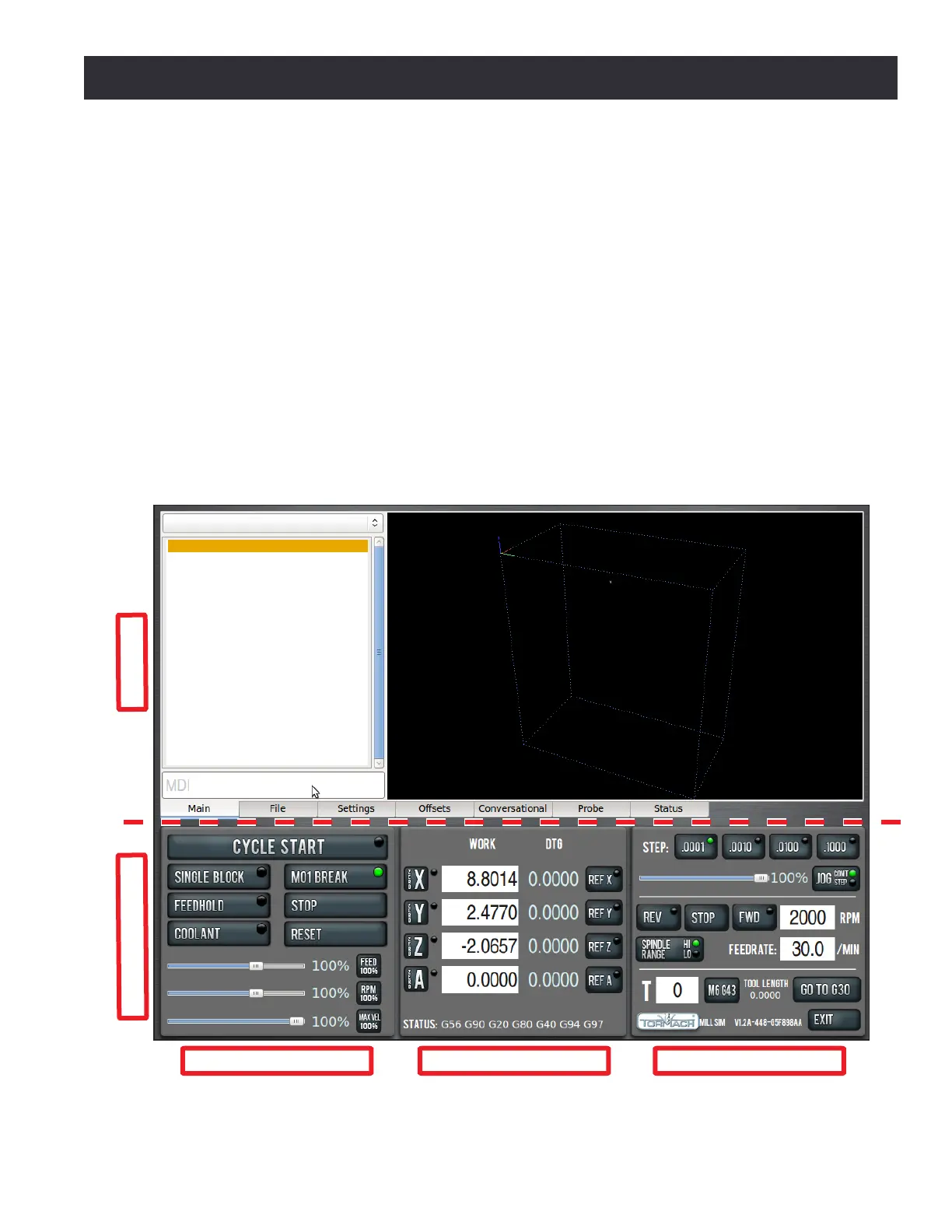 Sengs, Osets, Conversaonal, Probe, and Status. Depending on the mill accessories, there may