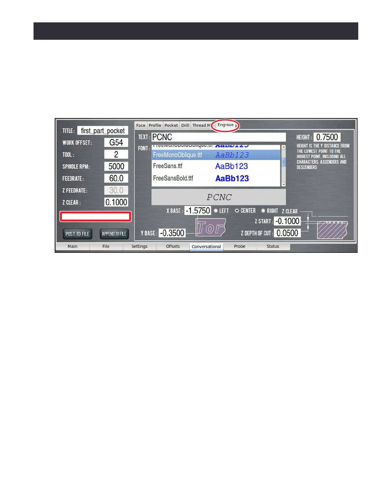Go back to the Conversaonal pages and click on the Engrave tab (see Figure 5.10) and the Engrave