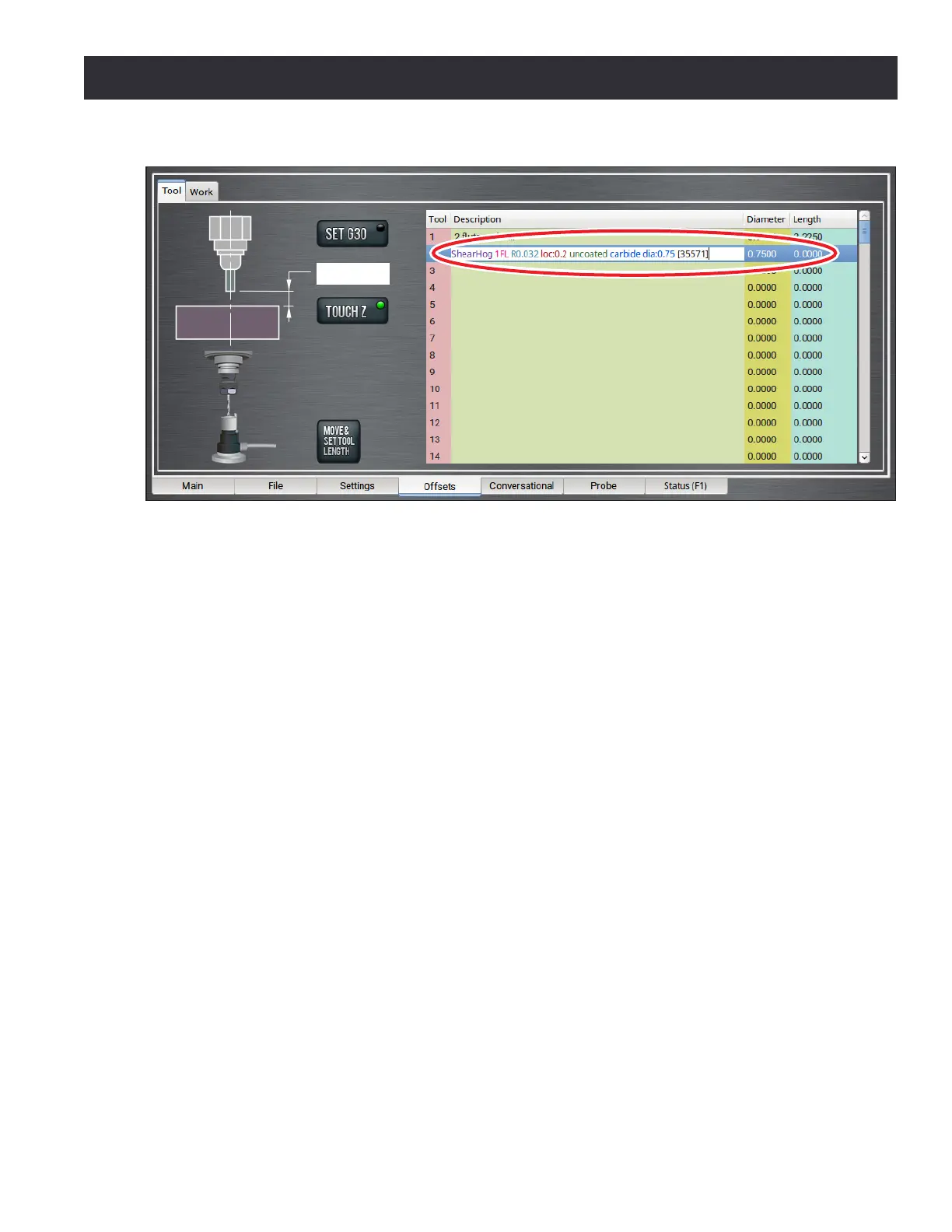 1. From the PathPilot interface, on the Osets tab, in the Tool Table window, select a blank line.