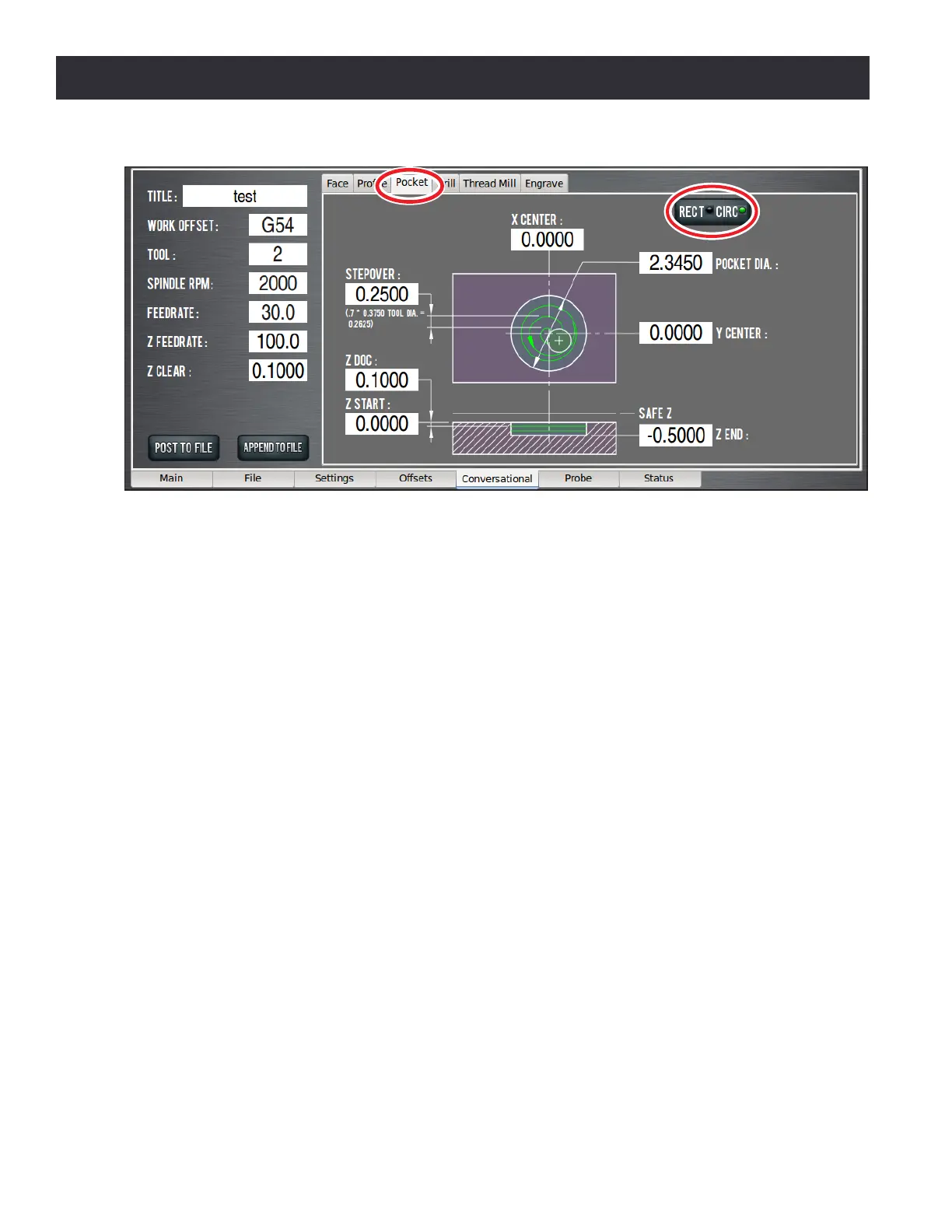 Pocket Dia. – Enter value of the pocket diameter. The tool radius is used to set the tool path diameter.