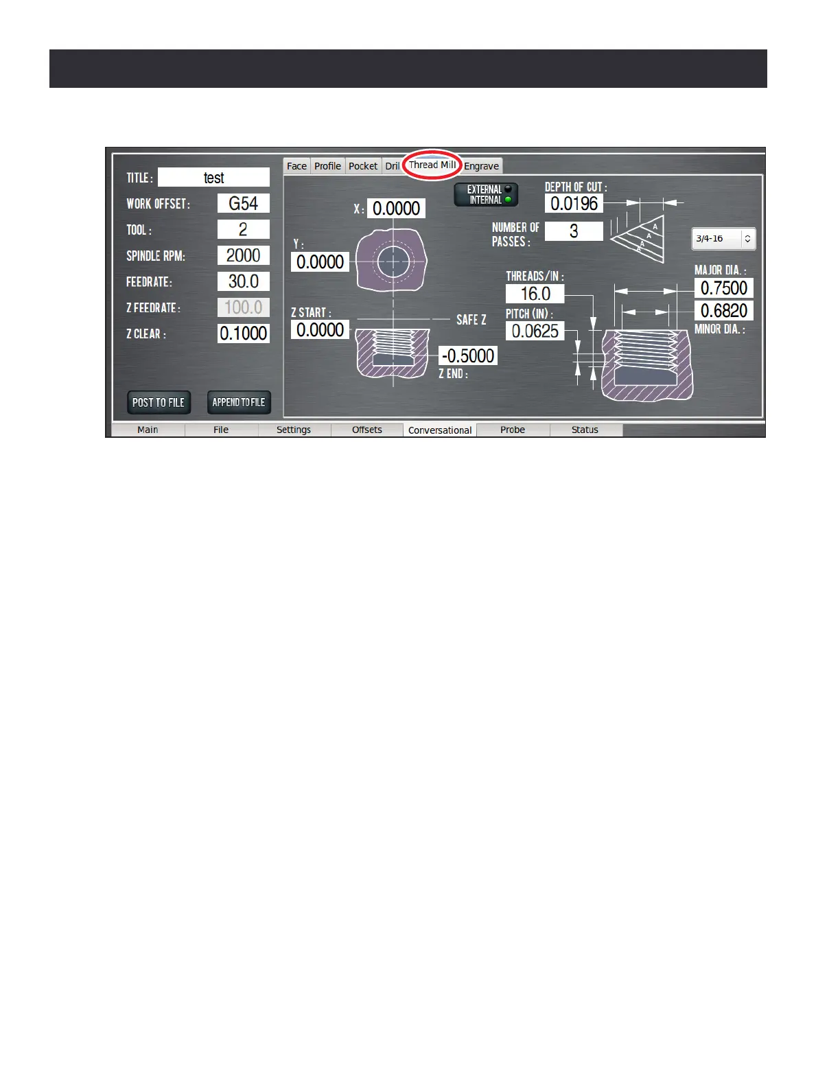 Depth of Cut – Sets the amount of material cut in each helical pass. The value entered is the distance