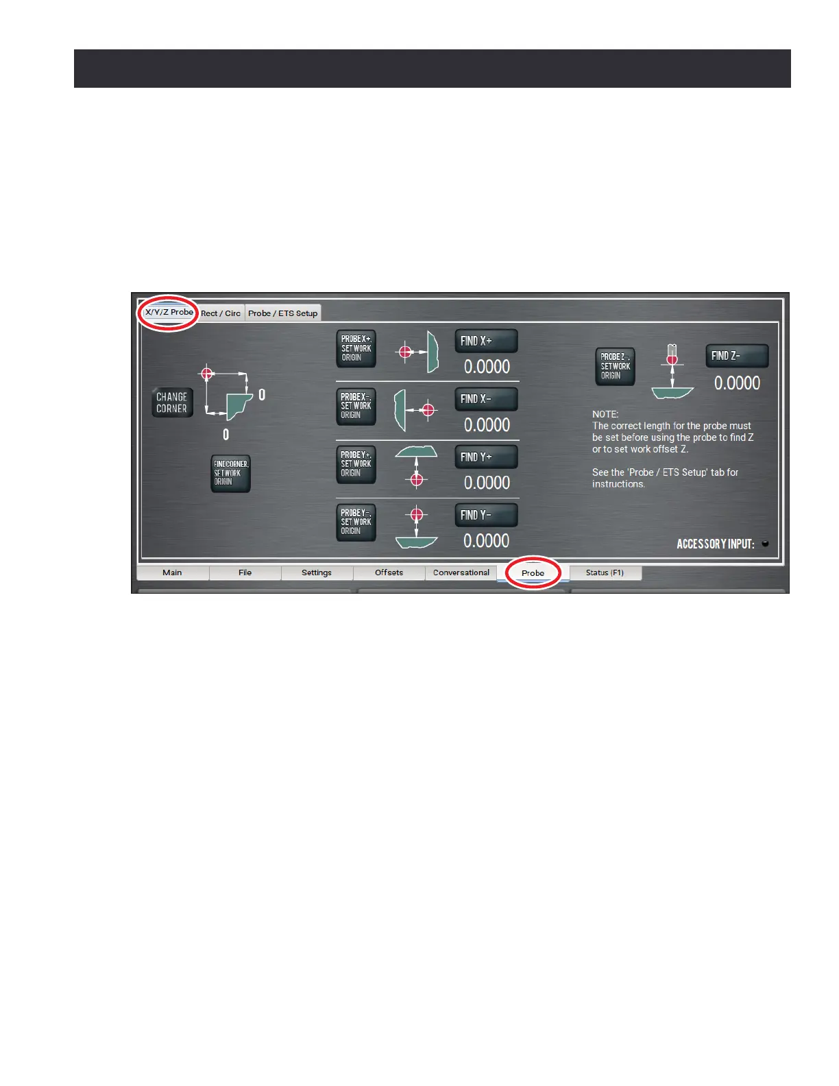 The X/Y/Z Probe tab allows the user to quickly touch o a workpiece or vise jaw to nd that feature’s