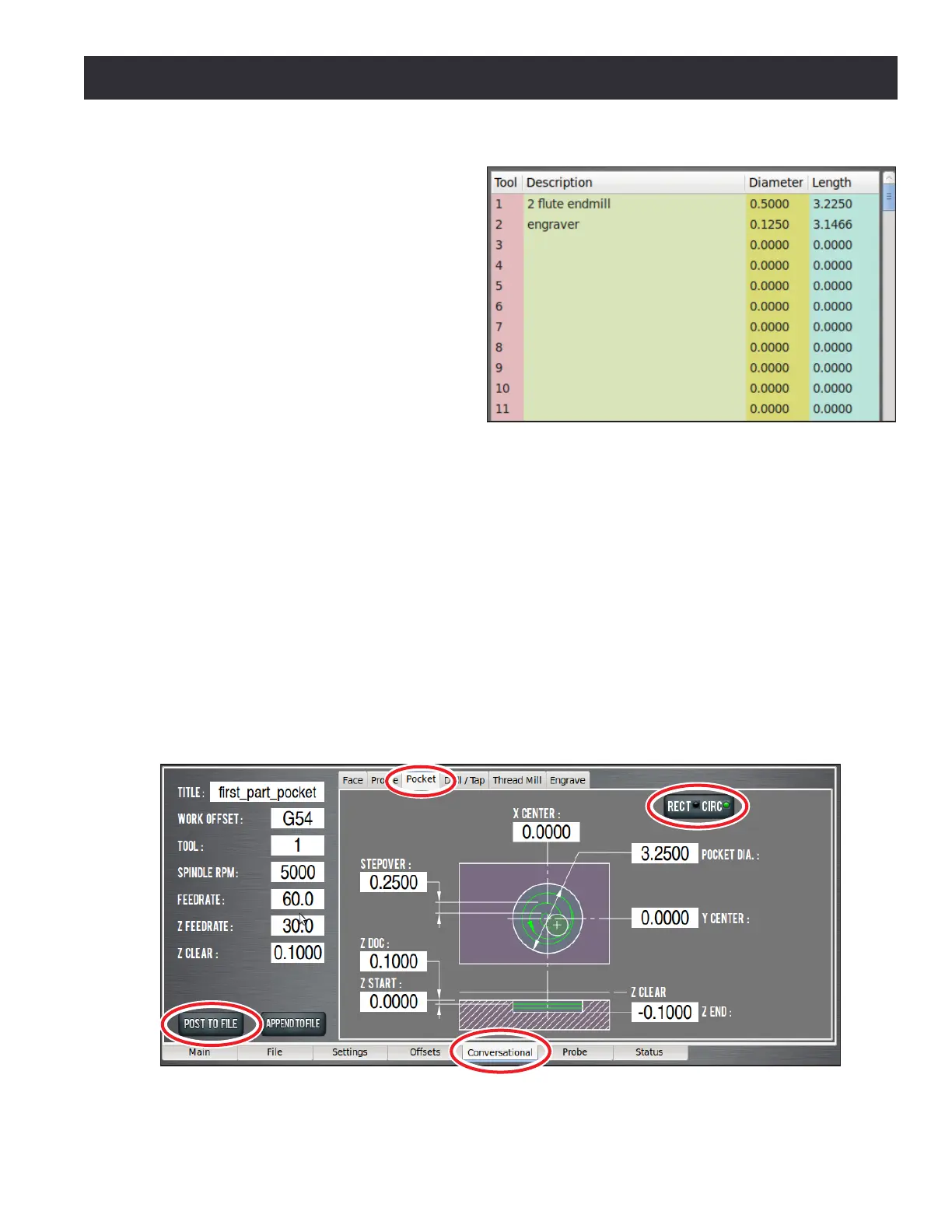 circular pocket screen (see Figure 5.10). Use this screen to generate code to create a shallow pocket