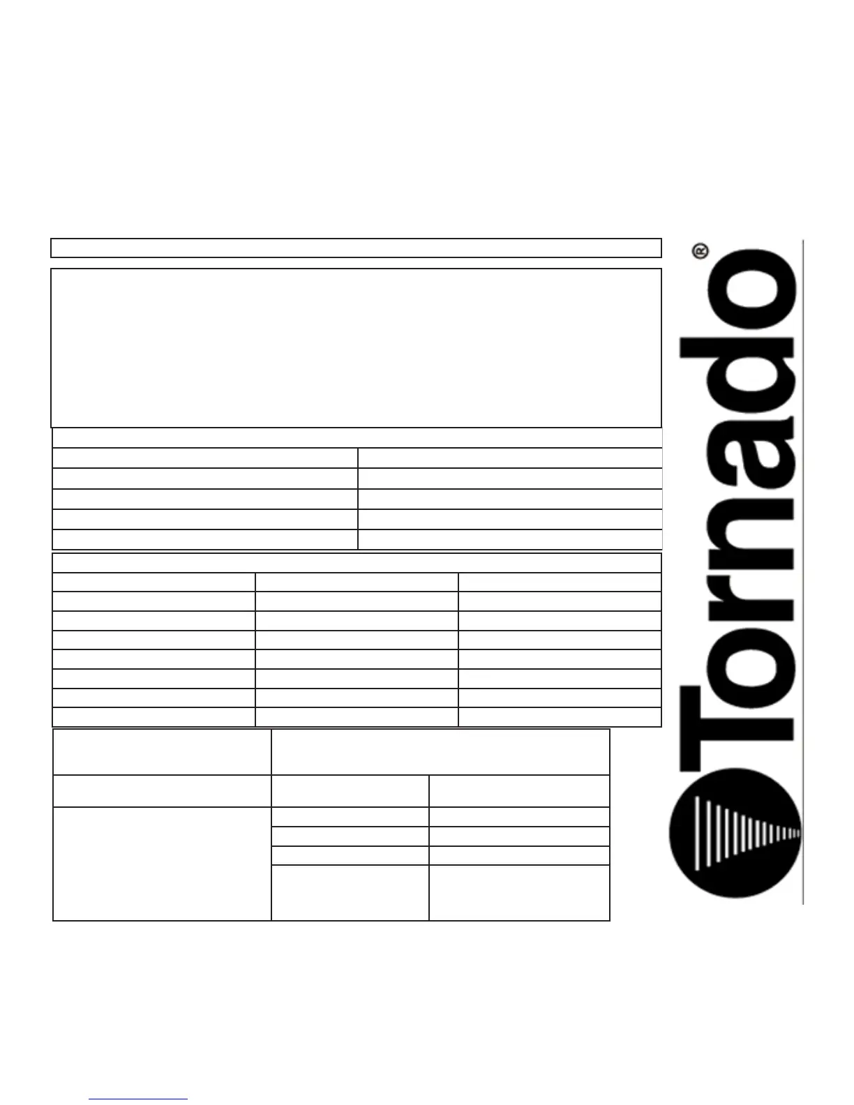 Si un défaut survient, la garantie est annulée si le service est tenté par des Centres Service Tornado non-