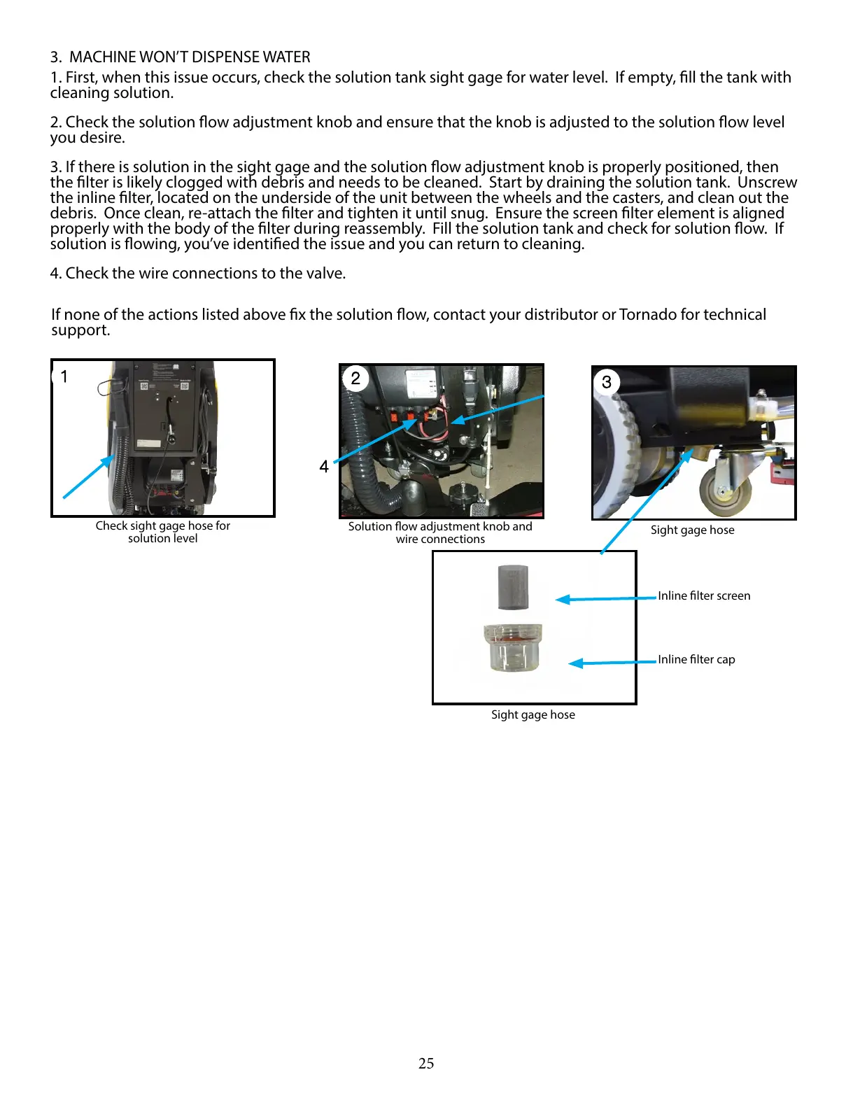 1. First, when this issue occurs, check the solution tank sight gage for water level. If empty, ll the tank with