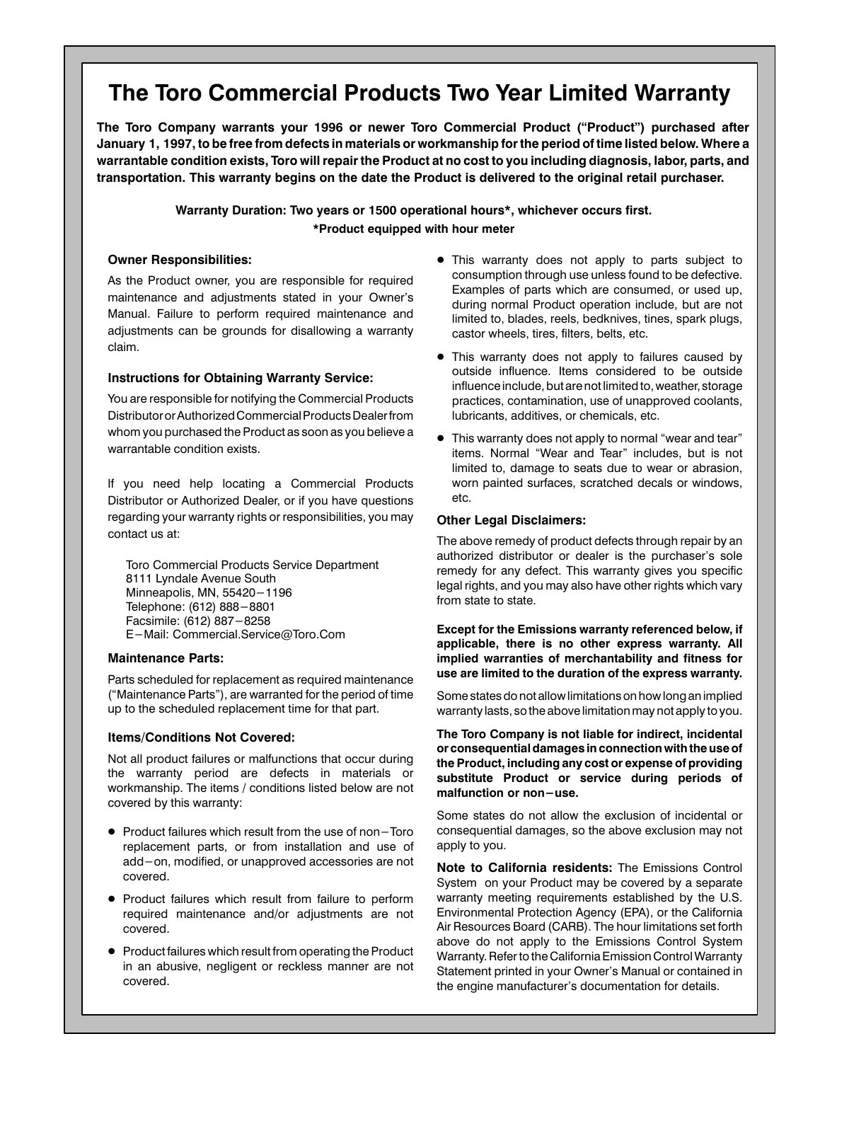 The Toro Company warrants your 1996 or newer Toro Commercial Product (Product") purchased after