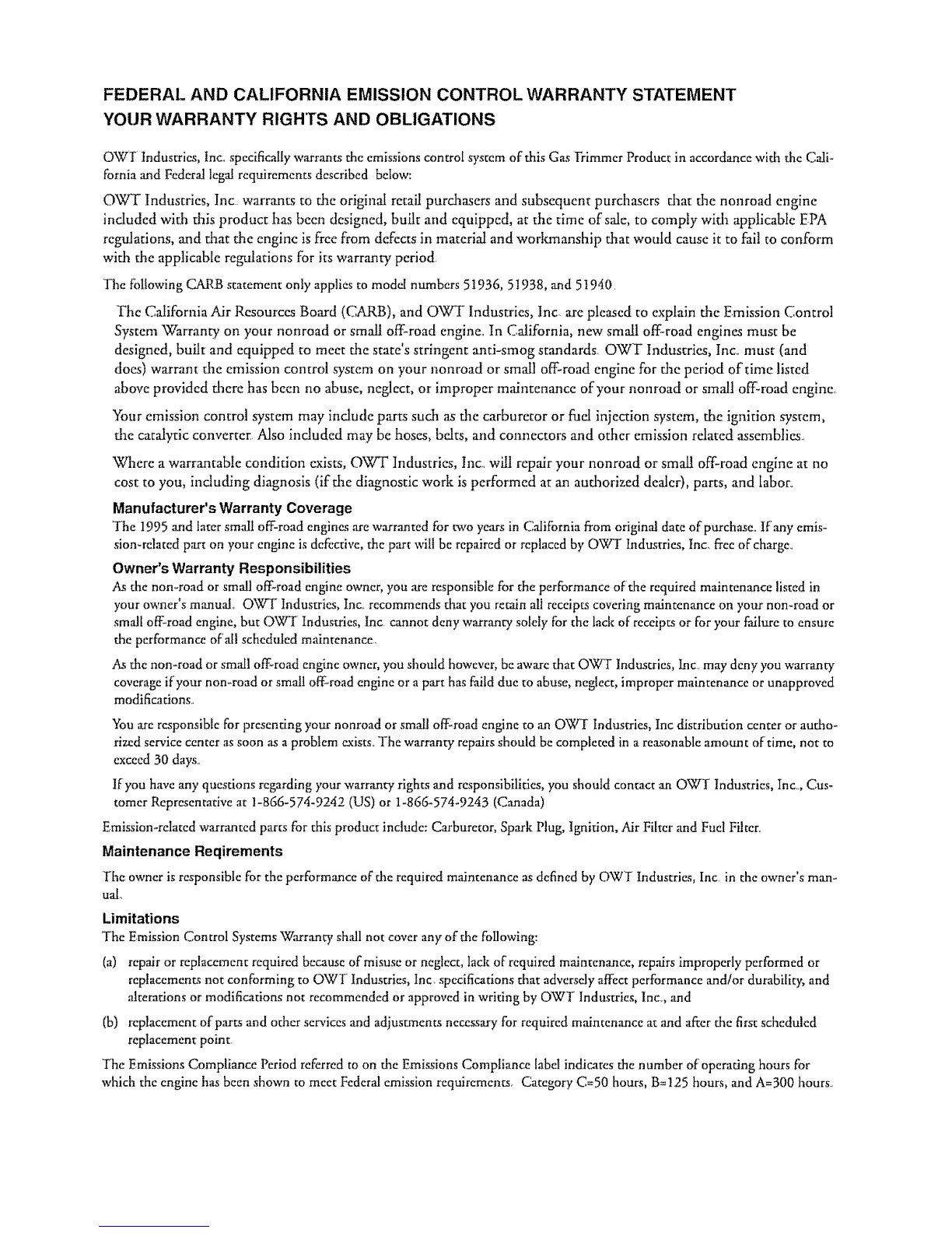OWl _industries, Inc,,specificallywarrants the emissions control systemof this Gas Trimmer Product in accordance with the Cali-