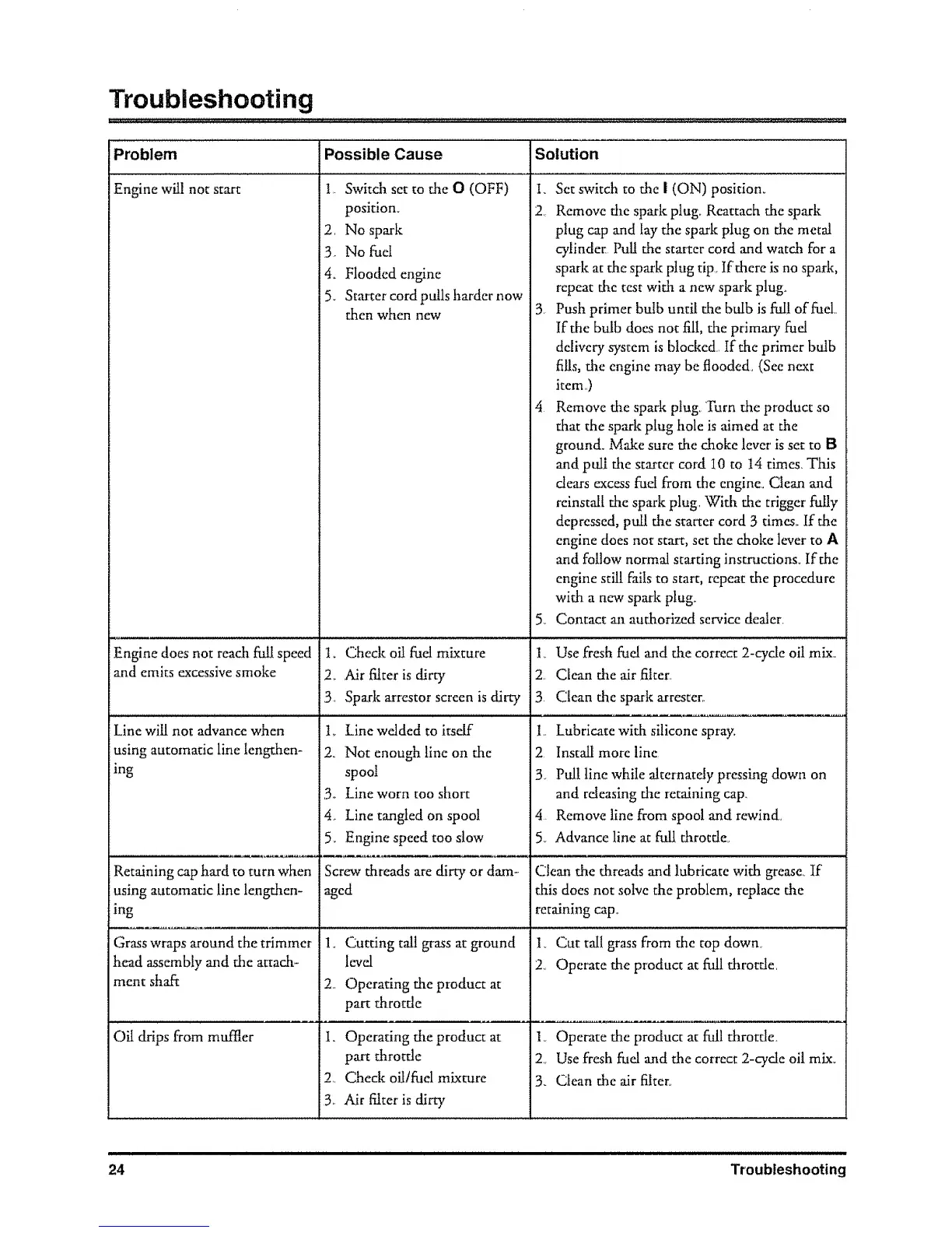 Toro 51934 - Troubleshooting Common Issues; Engine Will Not Start; Engine Performance Issues; Line Advancement Problems