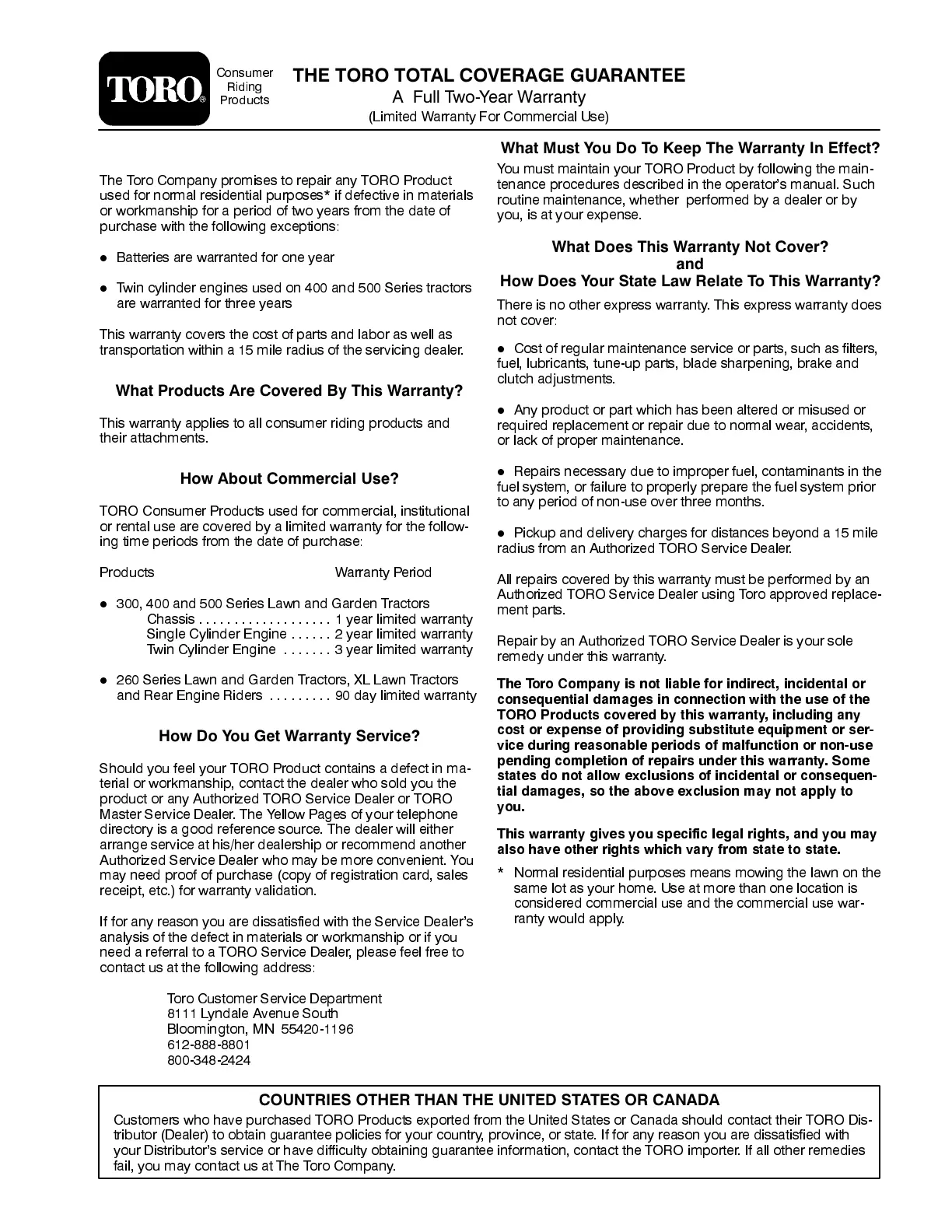 7KH 7RUR &RPSDQ\ SURPLVHV WR UHSDLU DQ\ 7252 3URGXFW