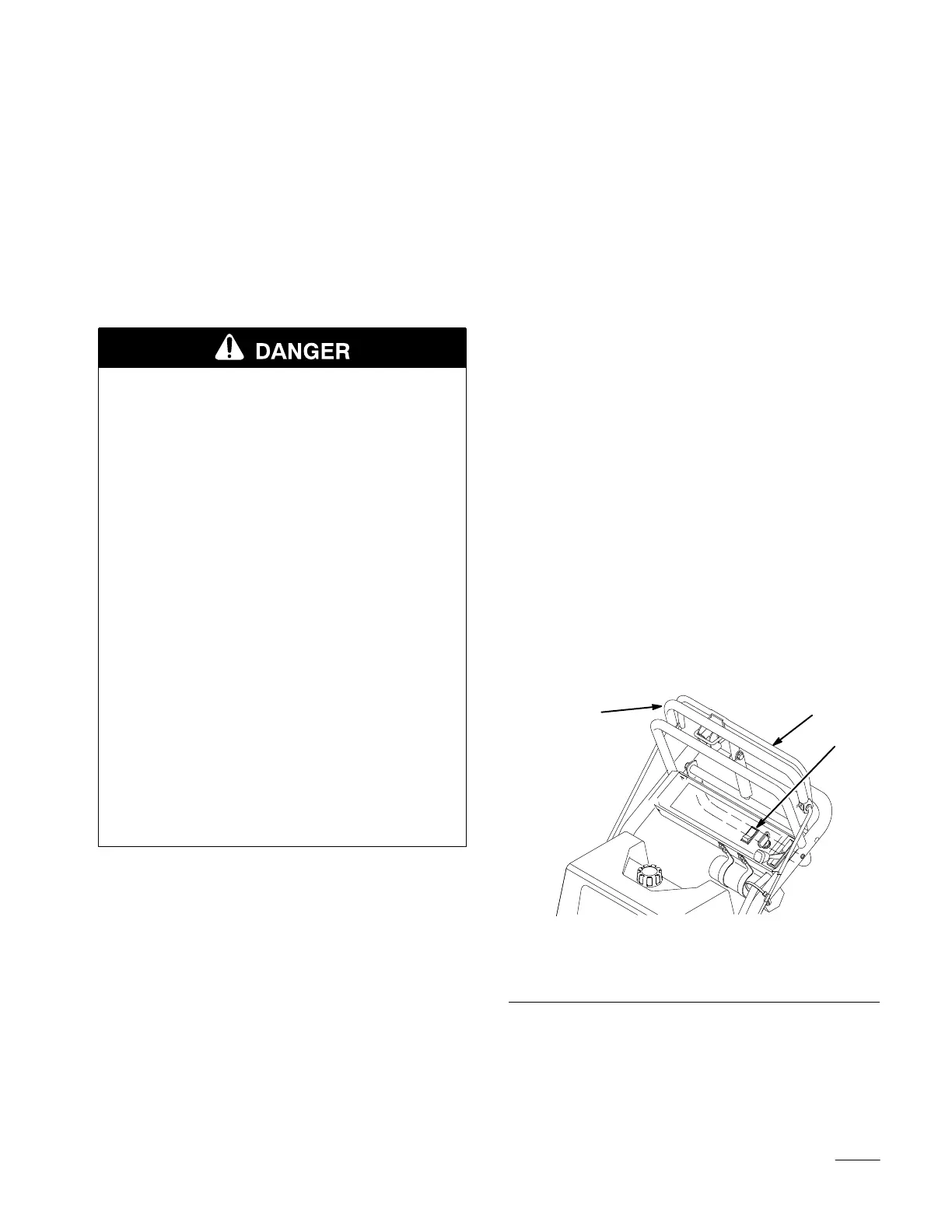 • Never try to clear discharge area or mower
