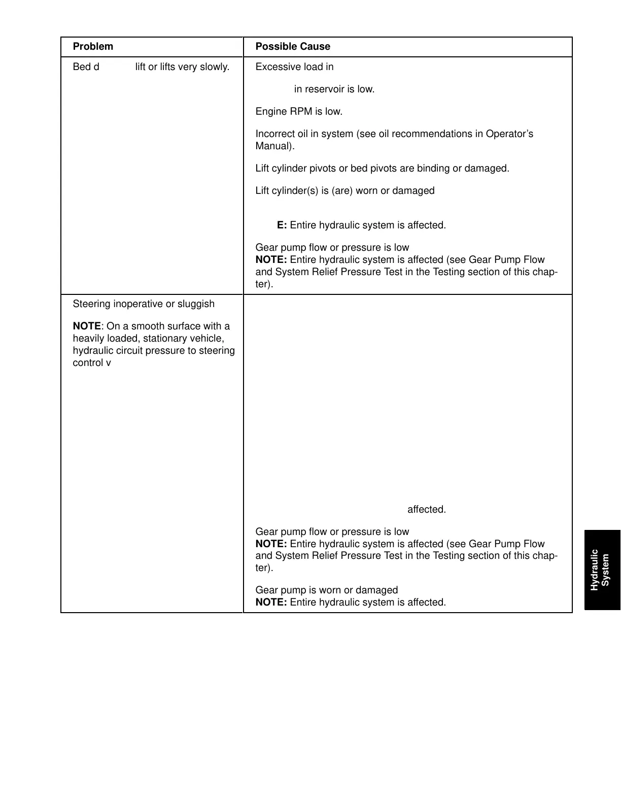 Lift cylinder pivots or bed pivots are binding or damaged.