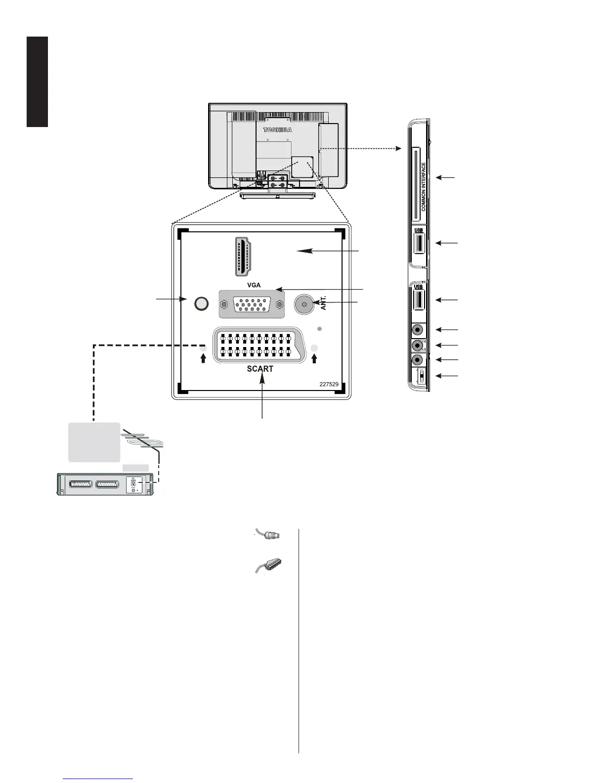Connect the aerial to the ANT. socket on the rear of the TV.