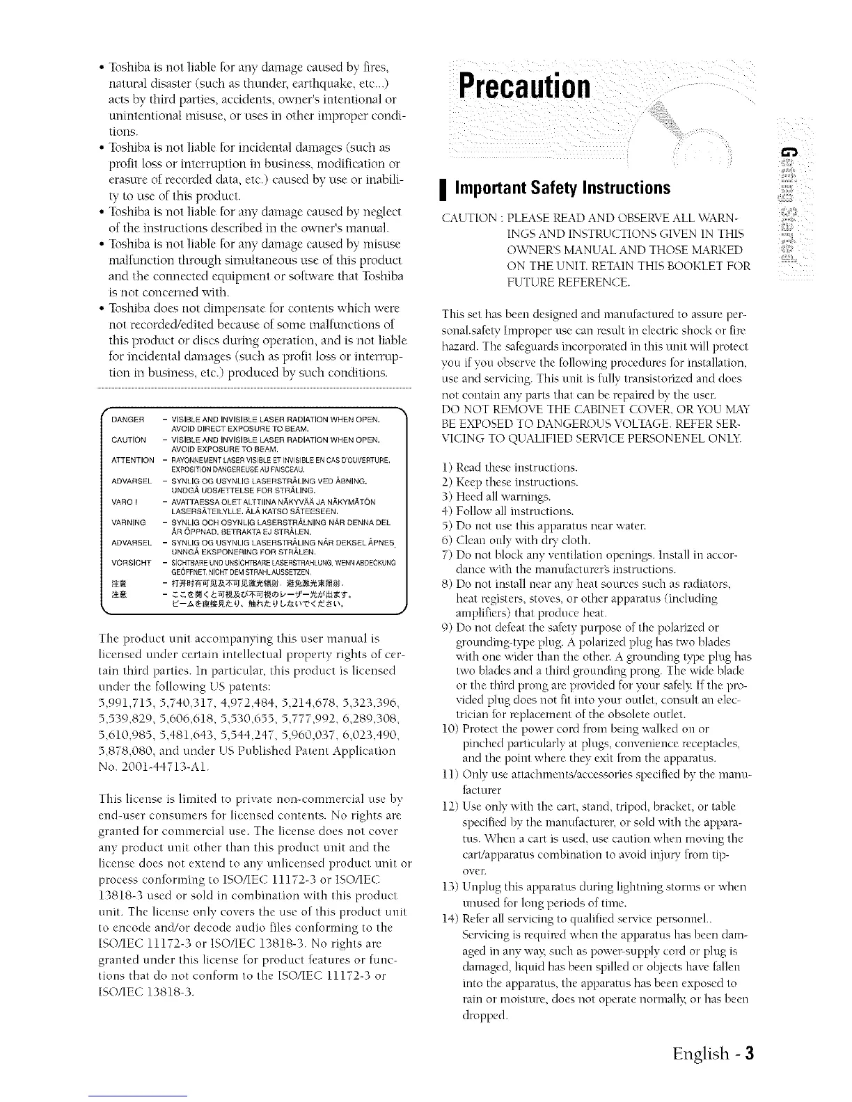 •Toshibais not liable [nr any damage caused by fires,