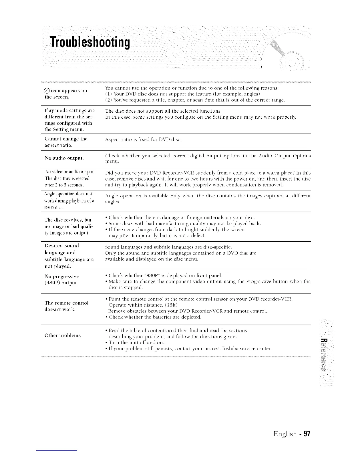 doesn't work. Remove obstacles between your DVD Rccordcr-VCR and remote control.