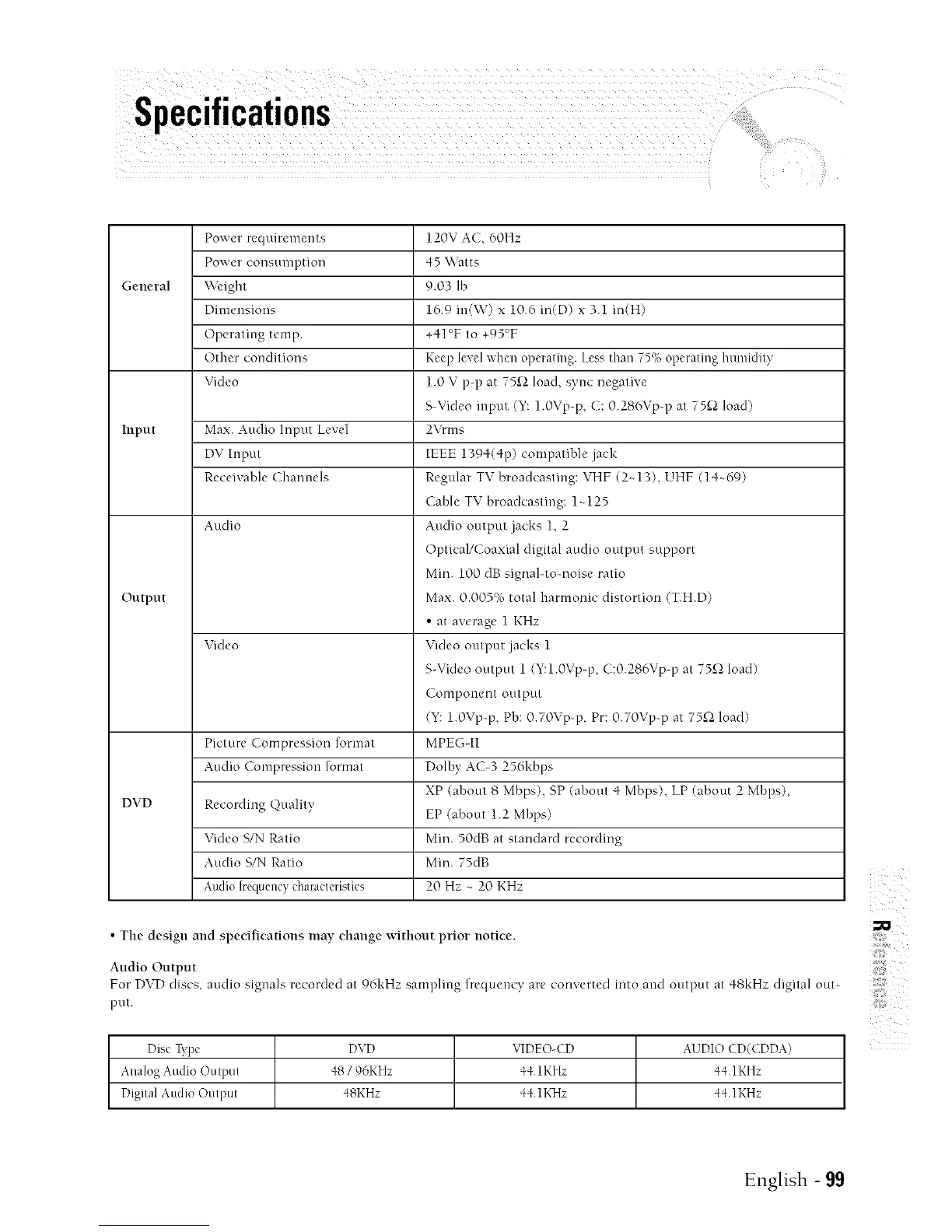 For DVD discs, audio signals recorded at 96kHz sampling frequency are convertecl into and output at 48kHz digital out-