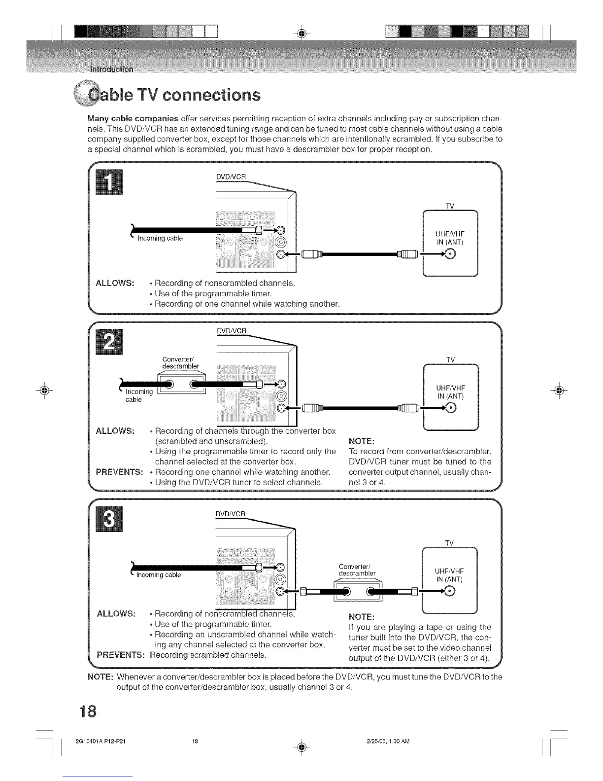 NOTE: Whenever a converter/descrambler box is placed before the DVD/VCR, you must tune the DVD/VCR to the