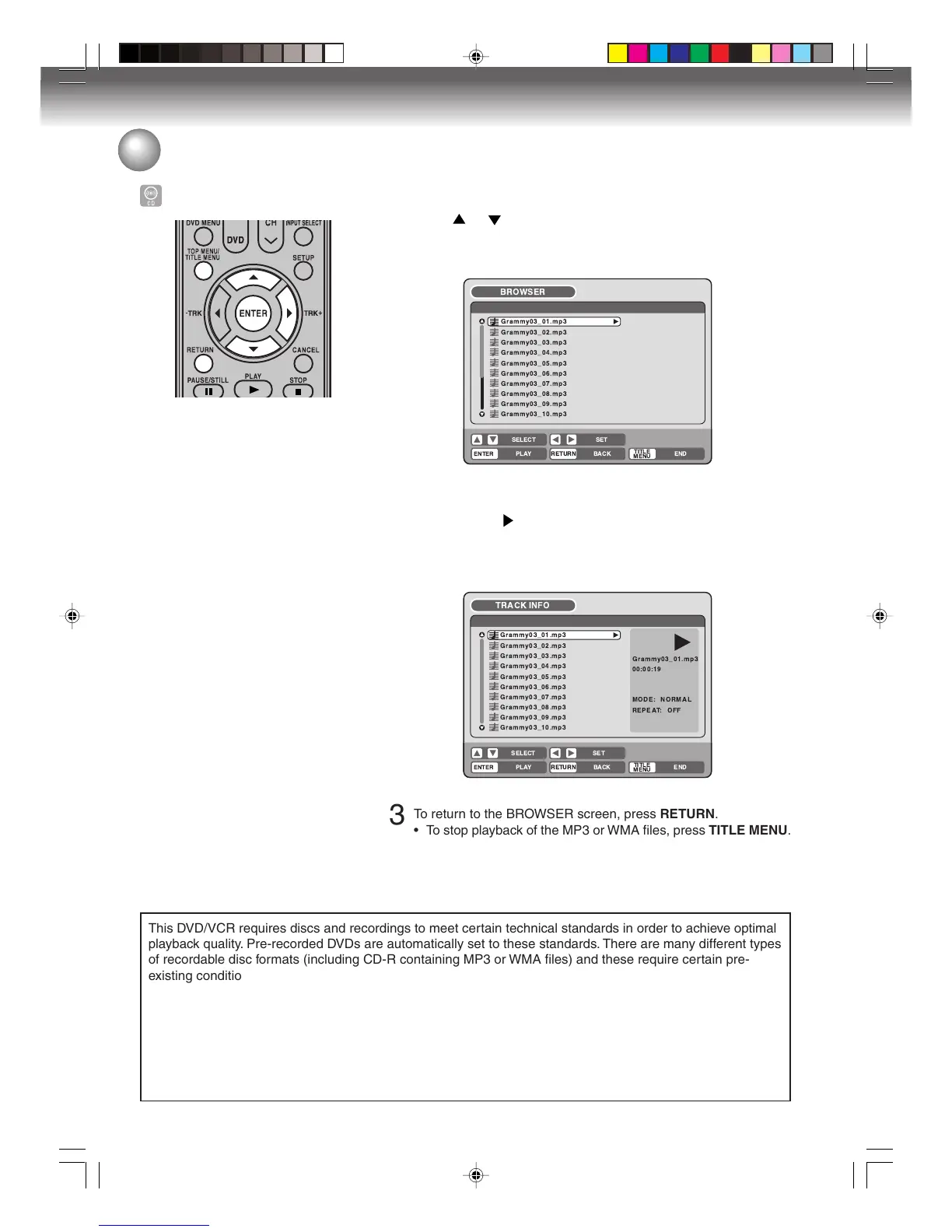 •To stop playback of the MP3 or WMA files, press TITLE MENU.