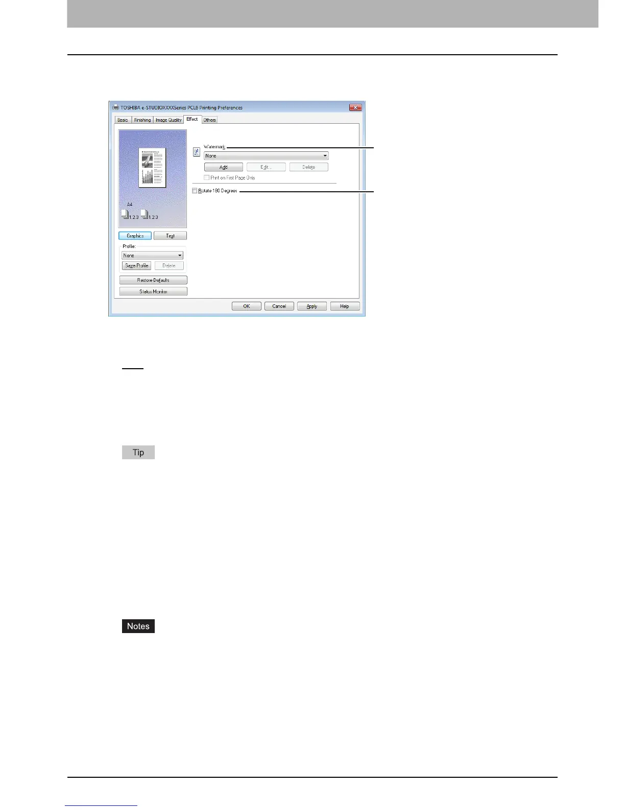 The [Effect] tab contains print options that add effects to your print jobs such as Watermarks and Rotate printing.