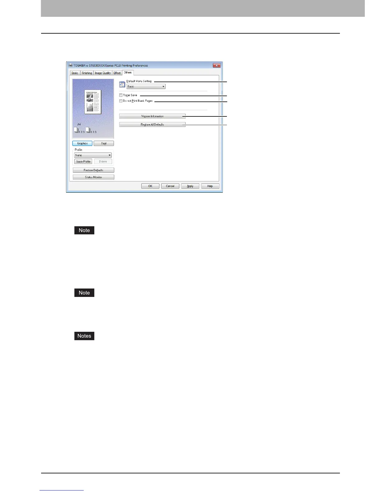 If you made settings on the [Others] tab menu from the print setting page of the application, they are restored to the