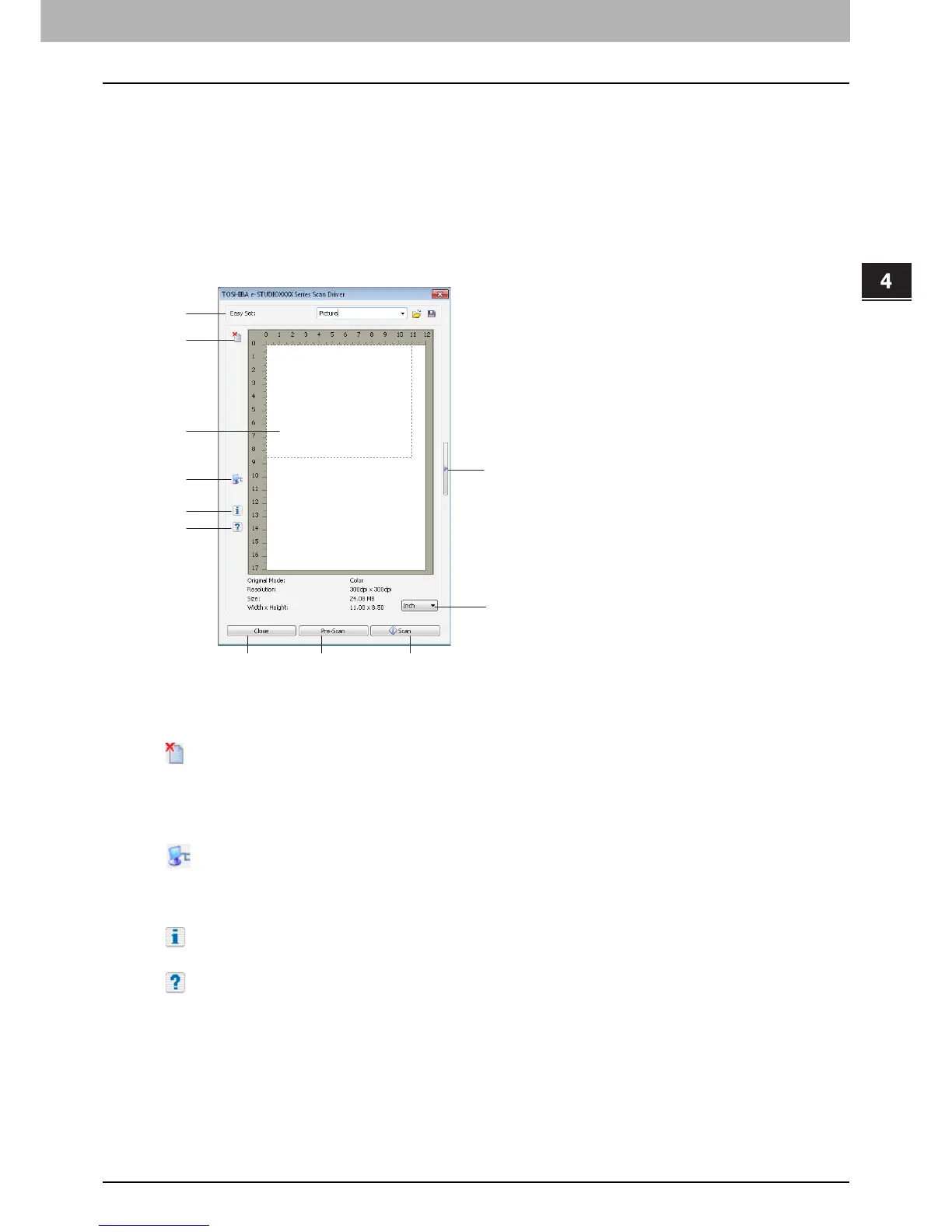 The pre-scanned image appears. The dotted boundary shows the scanning area or the original size. The image