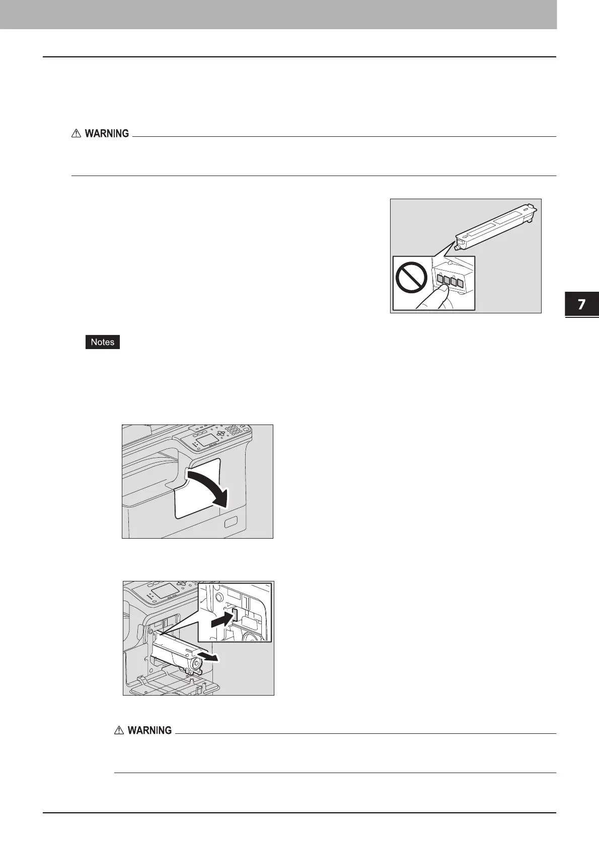 Do not touch the parts on the circuit board mounted on the toner cartridge because they may be