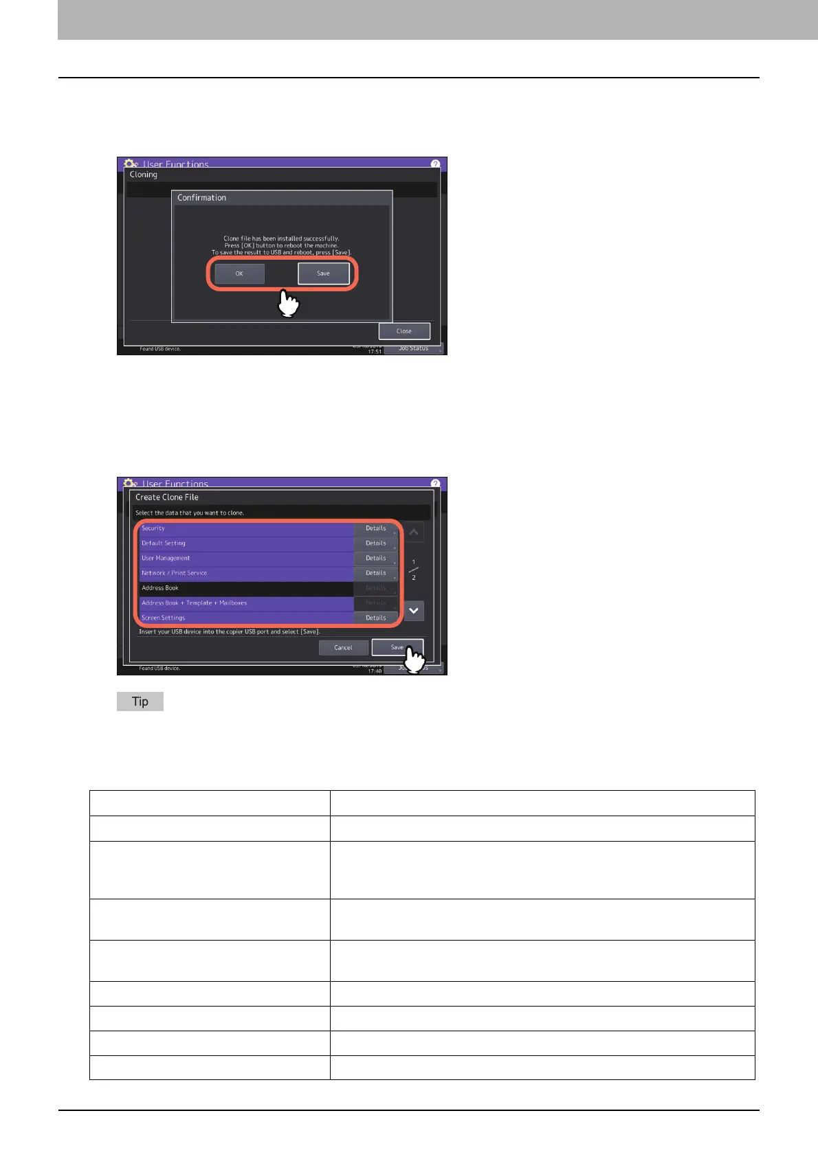 Press [Save] to save a file that records the result of the installation and reboot the equipment.