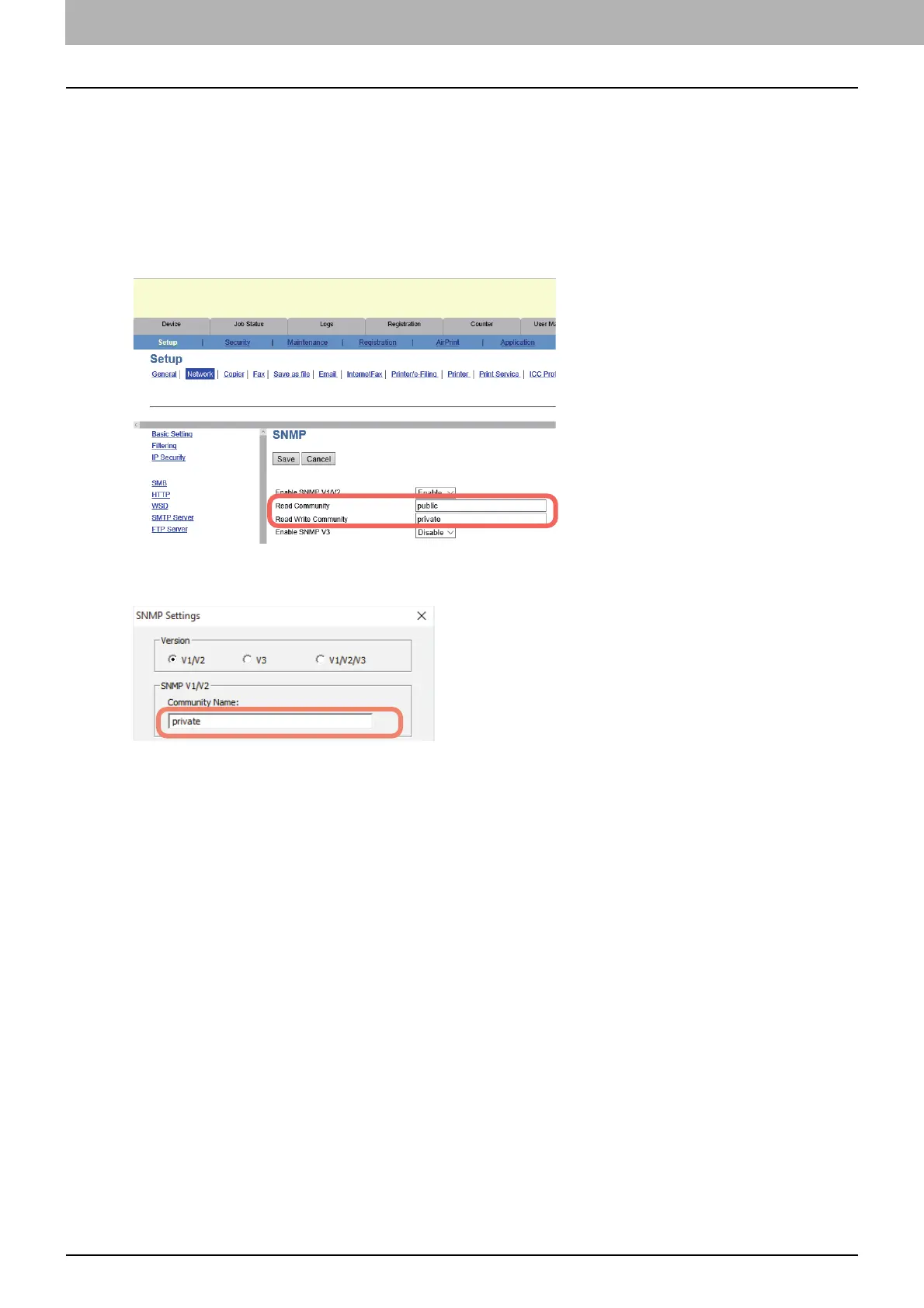 When the TCP/IP port is used, the SNMP community names must be the same in the following 3 settings.