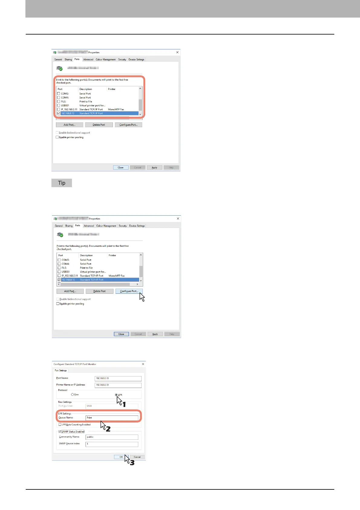 2. Select [LPR] at the [Protocol] group, enter “print” in the [Queue Name] box at the [LPR Settings] group, and