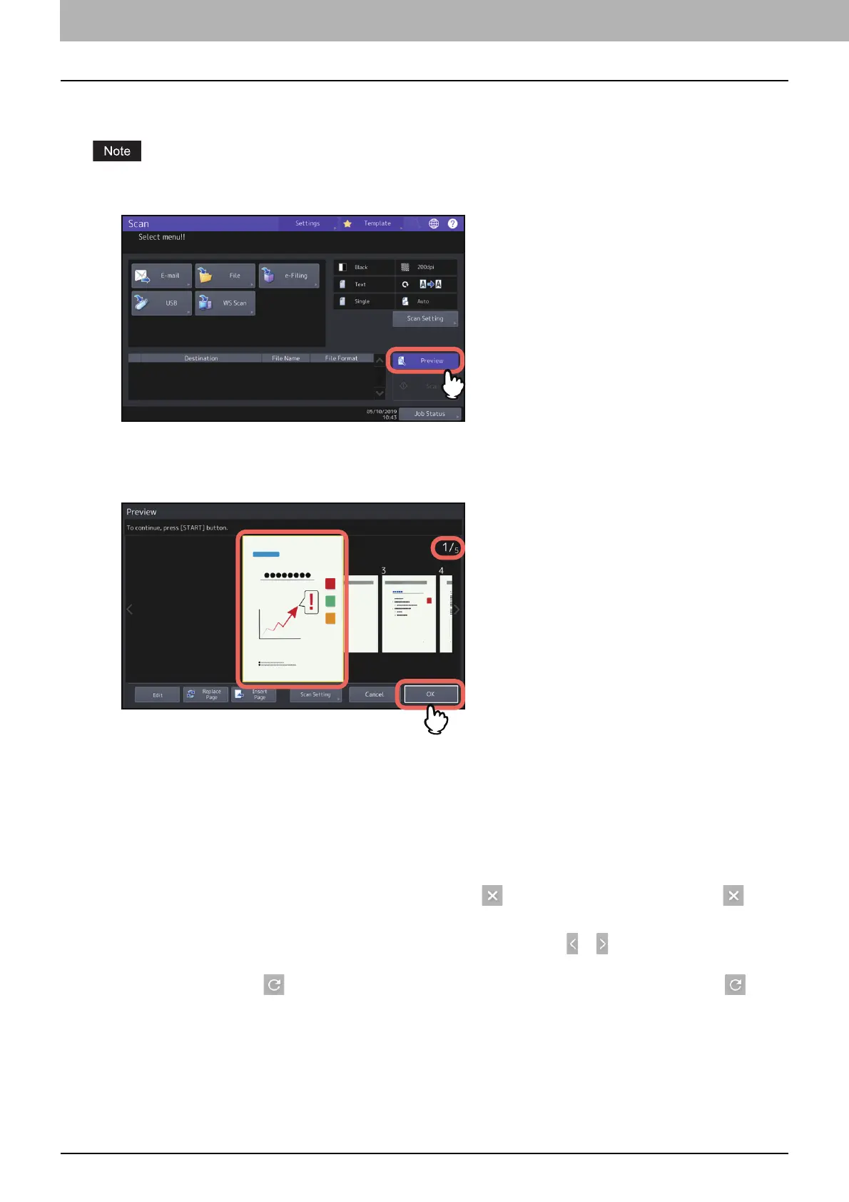 Carefully check the displayed preview of your scans and the number of pages. To save or e-mail