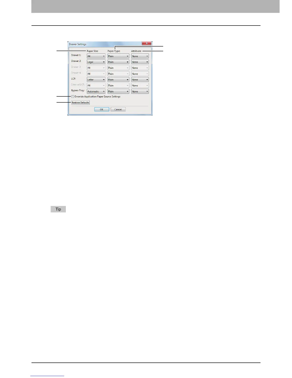 Click this to restore the settings displayed in the [Drawer Settings] dialog box to the original factory